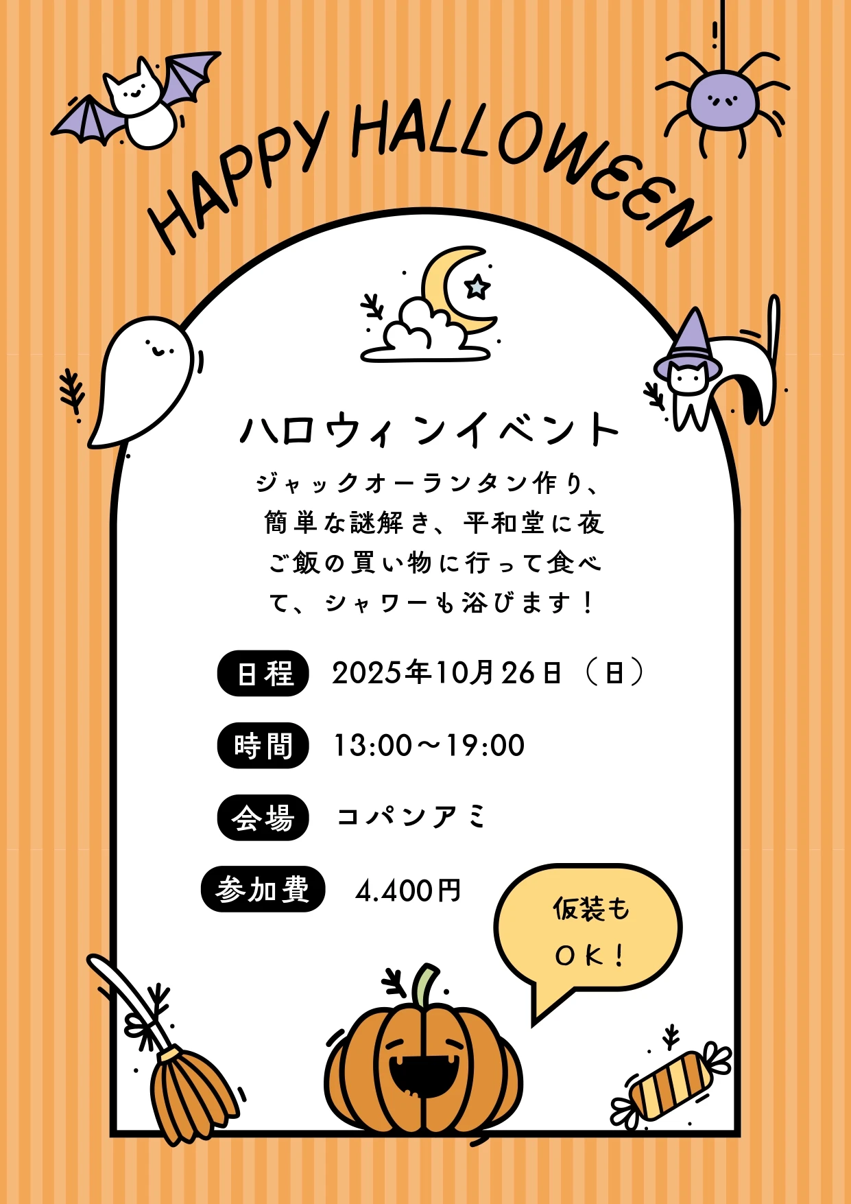 ハロウィンイベント開催! 2025.10.3 イベント・短期教室 ジャックオーランタン作り、簡単な謎解きで遊び 夜ご飯は平和堂へお買い物へ行きます。 最後にシャワーも浴びて帰るので、帰ったら寝るだけ! 皆様のご参加お待ちしています。 下記のお申込みフォームよりWEBご予約いただけます。 WEBでお申込み お申込みフォーム 電話で申し込み 0776-51-5890