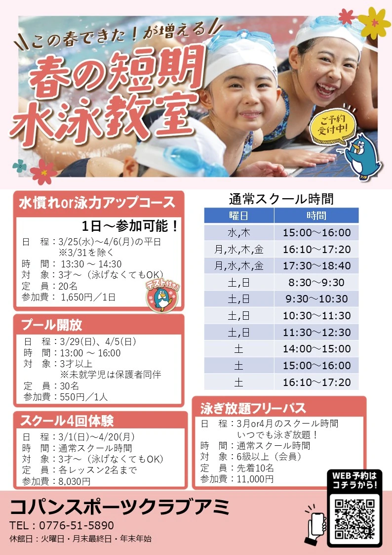 初心者も歓迎 ♪ 春の短期教室 2026.2.12 イベント・短期教室 この春プールで元気にステップアップ♪ 春休みの数日間で、集中して泳ぎのコツをつかもう! はじめてのお子さまも安心のサポート 小学生でクロールを泳げるようになりたい方にもぴったり 「できた!」が増える春にしよう? ぜひお気軽にご参加くださいね! WEBでお申込み お申込みフォーム 電話で申し込み 0776-51-5890