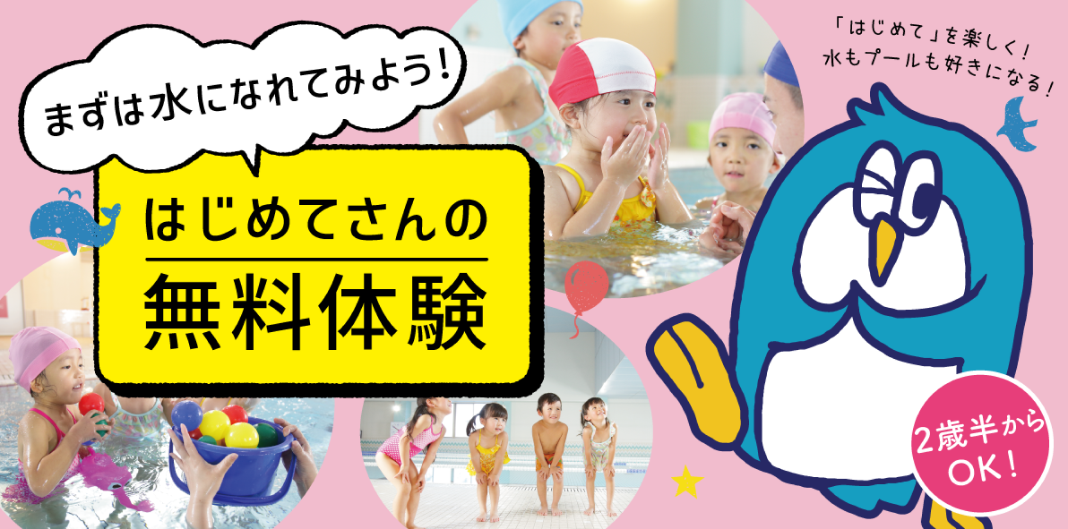 最近の記事 子供スイミング】入会をご検討のお客様向け 4月スクール通常スクールレッスン体験ができます。4/20(月)まで 2026.3.30 イベント more 【期間限定4/29(水)まで】スイミング入会キャンペーン! 2026.3.26 キャンペーン more ベビースイミング4月 1回無料体験! 2026.2.1 イベント more 休会制度の変更点に関するお知らせ 2024.9.4 お知らせ more