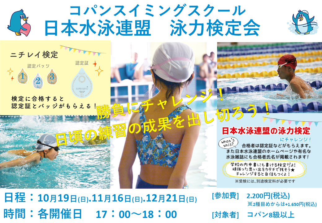 更なる高みへ!泳力認定会♪ 2025.9.26 イベント・短期教室 更なる高みへ!泳力認定会♪日頃の練習の成果を出し切って勝負にチャレンジ!日時:10/19(日).11/16(日).12/21(日)時間:17:00~18:00料金:2.200円(税込)※2種目めからは+1.650円(税込)泳力認定会 開催情報.pdf基準タイム.pdf泳力認定 練習会泳力認定合格を目指して苦手部分の克服、不安部分の解消をしよう!日時:10/12(日)時間:9:00~9:50料金:550円(税込) WEBでお申込み お申込みフォーム 電話で申し込み 058-240-5800