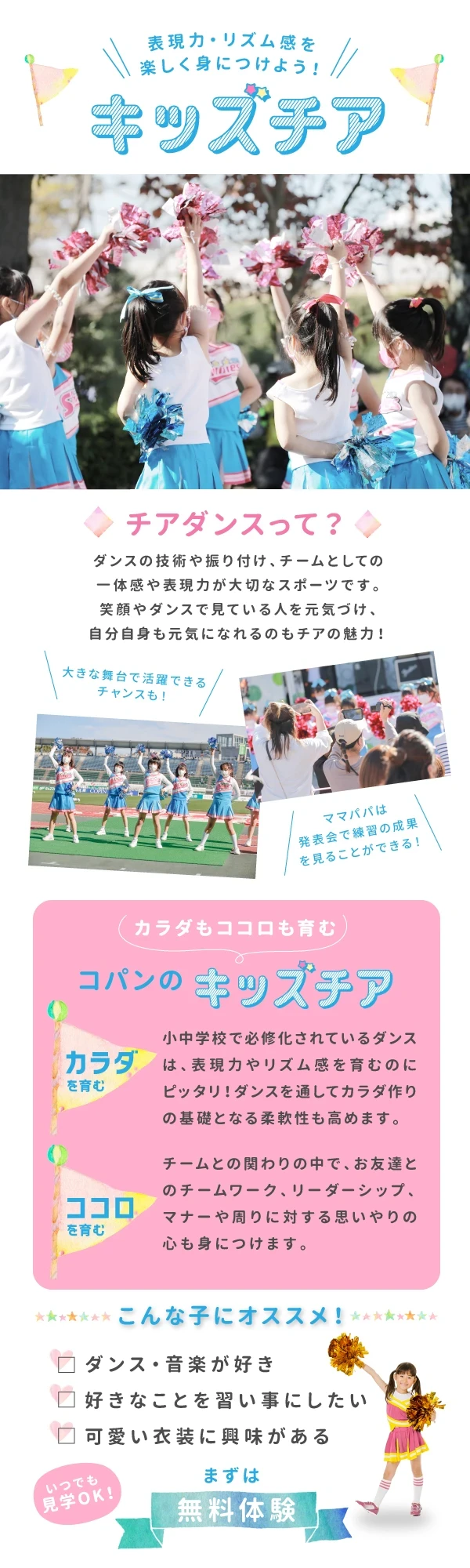 チアダンスは”人を応援すること”を目的として誕生したダンスで、「笑顔」を通じ相手に元気や勇気を与えます。