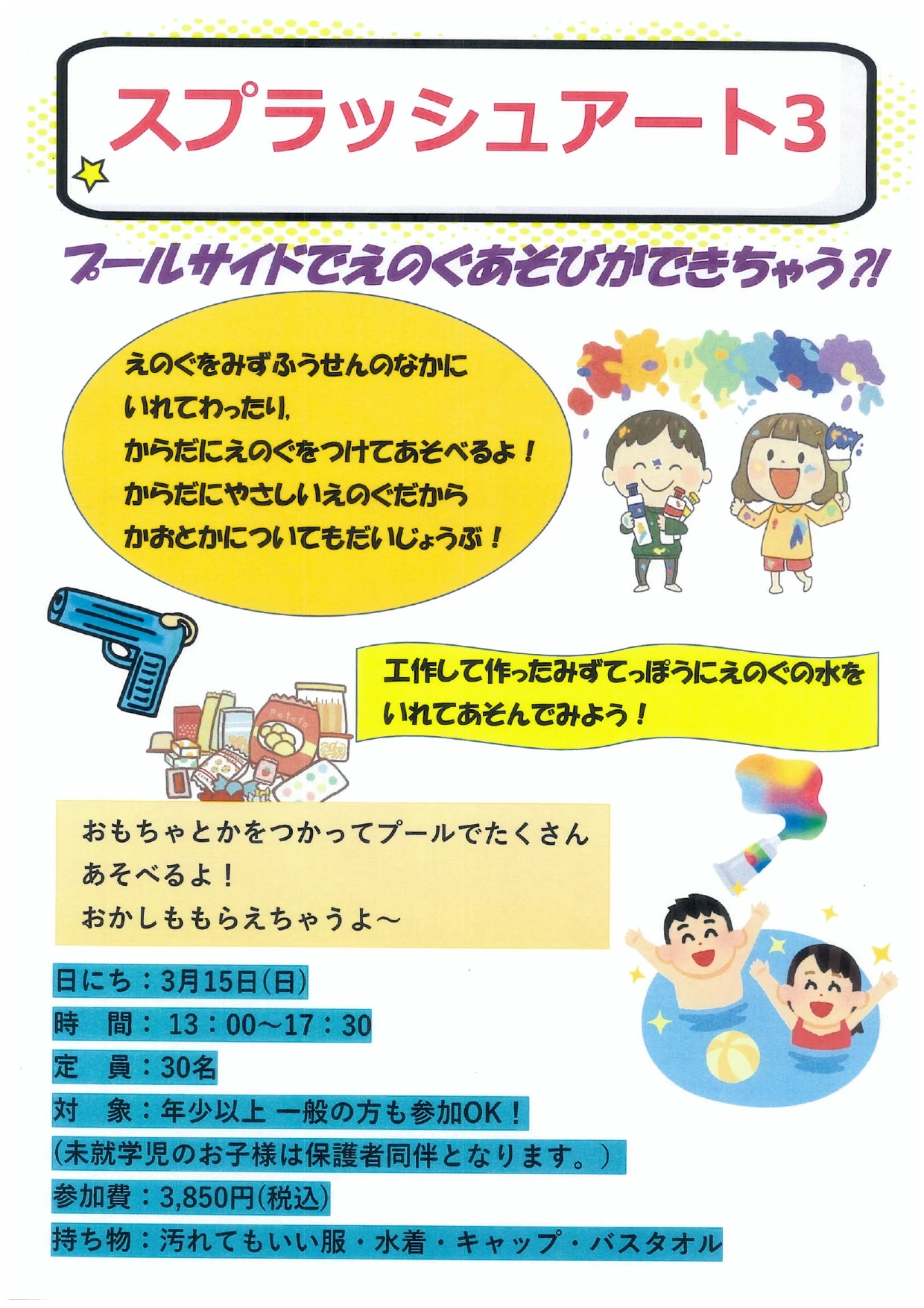 スプラッシュアート開催!! 2026.2.20 イベント・短期教室 絵具に水風船?普段できない爽快な体験を プールで思いっきりはじけちゃおう!! 今回は水鉄砲の工作もするよ。作った水鉄砲に絵の具を入れて遊ぼう~ 絵具で遊んだ後はプールでも思いっきり遊んじゃおう!! おかしももらえるよ! ▪️スプラッシュアート 3月15日(日) 13:00~17:30 WEBでお申込み お申込みフォーム 電話で申し込み 0776-22-4166 大人気イベント開催!普段では出来ないような遊びがコパンで出来ます。プールで遊べたり、お菓子ももらえるよ~みんなで遊びにきてね~ WEBでお申込み お申込みフォーム 電話で申し込み 0776-22-4166