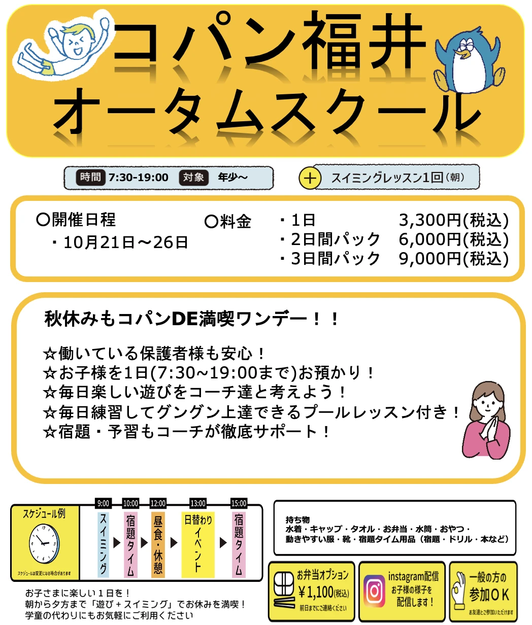 オータムスクール第2弾!!(スイミングレッスン付き) 2025.9.26 イベント・短期教室 ■オータムスクール2025!Ver.2 秋休みもコパンで!!! 工作をしたり公園やプールで遊んだりの1日イベント! コーチ達が秋休みの宿題も徹底サポート! もちろんスイミングレッスンもありますよ! 朝から夕方まで1日満喫できますね!会員以外の方も参加OK! お友達を誘って遊びに来てね! 他とは違ったコパンオリジナルのワンデーキーパー!! 開催日時 ♦オータムスクール 7:30~19:00までお預かり可*9:00までにお越しください ・10/21(火)〜26(日)*当日9時まで受付可(お電話・HPより) 対象 年少~ 定員 各日20名 料金 1日 3,300円(税込) 選べる2日間パック 6,000円(税込) 選べる3日間パック 9,000円(税込) お弁当 1,100円(オプション) 持ち物 お持ちの水泳道具一式・勉強道具など 詳しくはメールまたはフロントまでお気軽にお問い合わせください その他 先着順・定員制です WEBでお申込み お申込みフォーム 電話で申し込み 0776-22-4166 WEBでお申込み お申込みフォーム 電話で申し込み 0776-22-4166