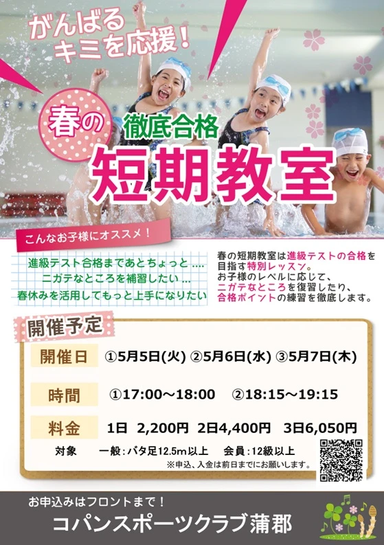 初心者も歓迎 ♪ 春の短期教室 2026.4.7 イベント・短期教室 この春プールで元気にステップアップ♪ 春休みの数日間で、集中して泳ぎのコツをつかもう! はじめてのお子さまも安心のサポート 小学生でクロールを泳げるようになりたい方にもぴったり 「できた!」が増える春にしよう? ぜひお気軽にご参加くださいね! 5月短期教室 5/5(火)17:00~18:00 18:15~19:15 5/6(水)17:00~18:00 18:15~19:15 5/7(木)17:00~18:00 18:15~19:15 WEBでお申込み お申込みフォーム 電話で申し込み 0533-69-2191 WEBでお申込み お申込みフォーム 電話で申し込み 0533-69-2191