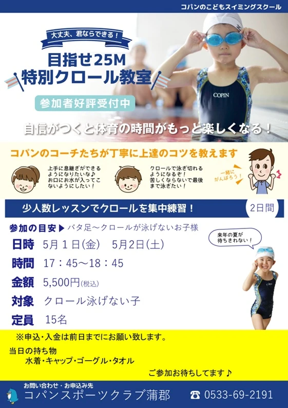 5月クロール特訓会 2026.4.7 イベント・短期教室 GWにクロールを習得しよう! 目指せ25m! WEBでお申込み お申込みフォーム 電話で申し込み 0533-69-2191 クロールの習得を目指します!クロールが不安な子、すでに泳げるけどきれいに泳げるようになりたい子お待ちしてます♪ WEBでお申込み お申込みフォーム 電話で申し込み 0533-69-2191