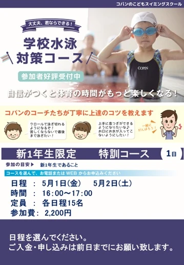 新1年生限定! 学校プール対策教室 2026.4.7 イベント・短期教室 新1年生限定! 学校プールが始まる前に練習しよう♪ WEBでお申込み お申込みフォーム 電話で申し込み 0533-69-2191
