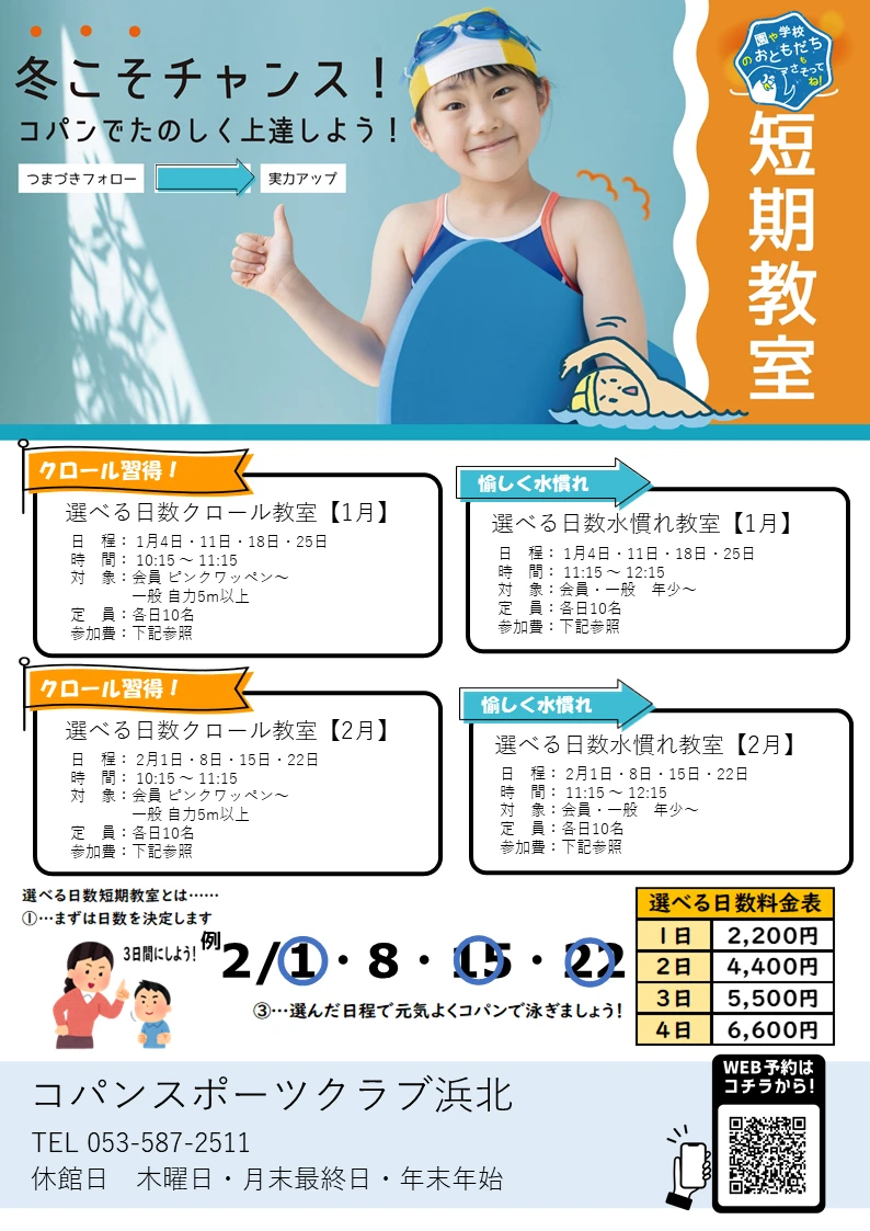 期間限定!冬の短期教室 2025.12.24 イベント・短期教室 寒い季節でも、あったかプールで元気にステップアップ♪ 集中して泳ぎのコツをつかもう! はじめてのお子さまも安心のサポート 小学生でクロールを泳げるようになりたい方にもぴったり 「できた!」が増える冬にしよう❄️ ぜひお気軽にご参加くださいね! WEBでお申込み お申込みフォーム 電話で申し込み 053-587-2511