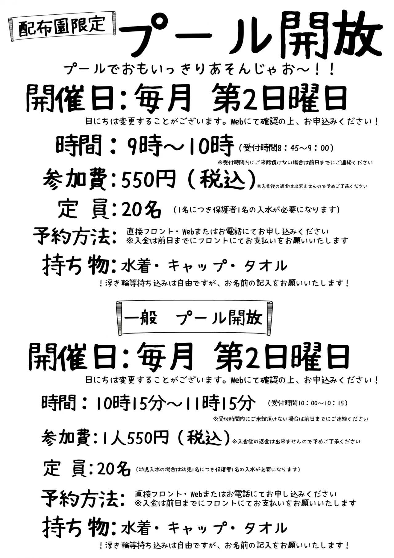 (①②幼児が入水の場合は1名につき保護者1名の入水が必要になります)