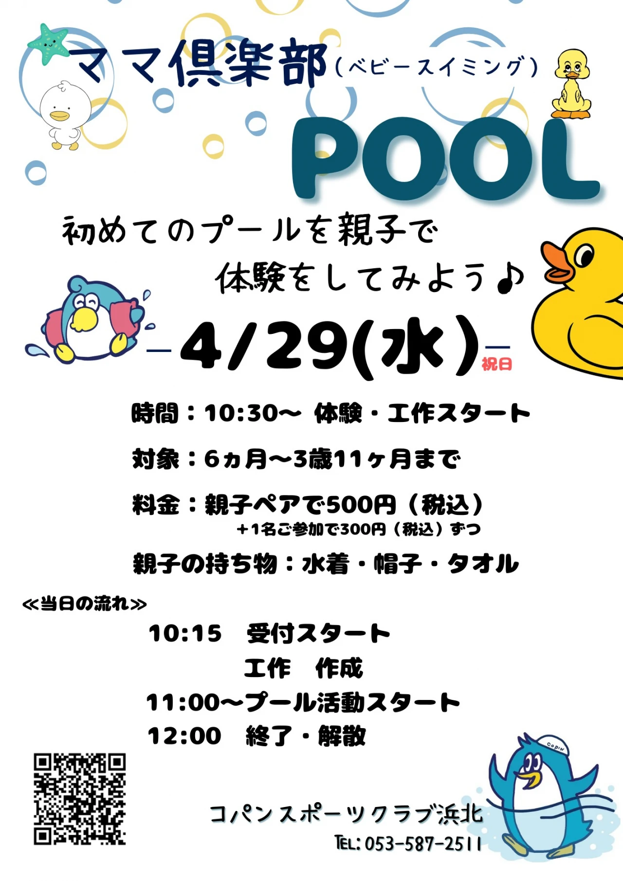 ~ママ倶楽部~(ベビースイミング)4/29(水)※祝日 2026.3.18 イベント・短期教室 親子で工作・プール体験!! 時間: 10:30~12:00(受付時間10:15~) 初めてのプールをおうちの方、お友達と一緒に楽しもう♬ みんな誘って遊びにきてね♡ 開催日時 4月29日(水)※祝日 10:30~12:00 (当日受付開始時間 10:15~10:30) (受付時間内で受付できない方は4月28日(火)17:00までにご連絡ください) 対象 6ヶ月~のお子様と保護者様 定員 20名 参加費 500円(税込) ※+1名参加の場合は追加で300円(税込) (参加費のお支払いは4月28日(火)までにお願いします) 持ち物 水着・キャップ・タオル WEBでお申込み お申込みフォーム 電話で申し込み 053-587-2511