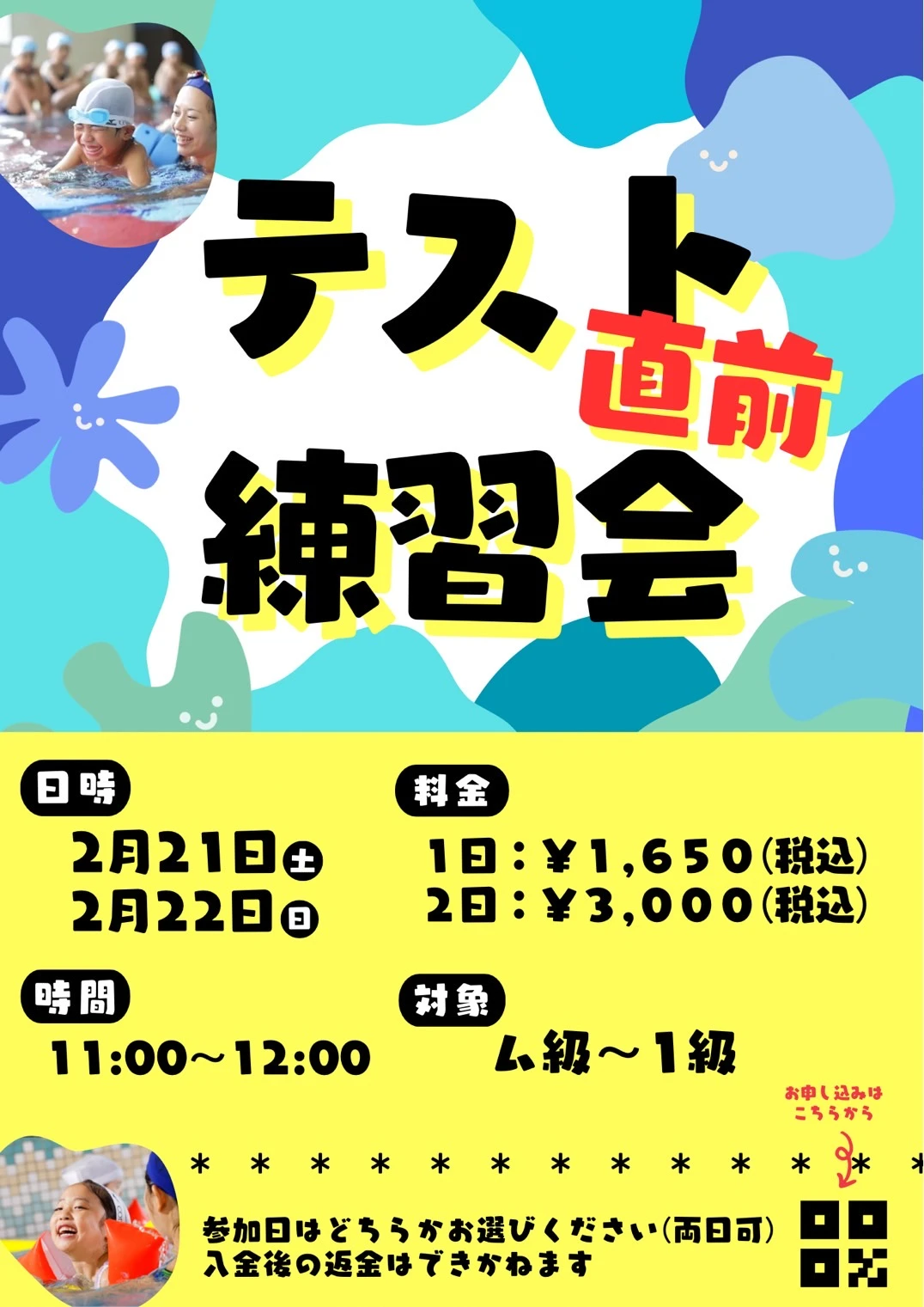 テスト直前、テスト対策練習会!! 2026.1.13 イベント・短期教室 2月23日(月)から始まるテストに向けて直前練習会を実施します!! 小人数レッスンでテスト合格に向けてレッスンをします。 泳ぎのコツなど、テスト前にコーチにいっぱい教えてもらおう!! 【コース】 テスト直前練習会!! 【日程】 2月21日(土)・22日(日) 【時間】 11:00~12:00 【対象】 コパンスポーツクラブ放出ジュニアスクール生 【参加費】 1日のみの参加の場合1,650円(税込) 2日間参加の場合3,000円(税込) WEBでお申込み お申込みフォーム 電話で申し込み 06-6965-0300 WEBでお申込み お申込みフォーム 電話で申し込み 06-6965-0300