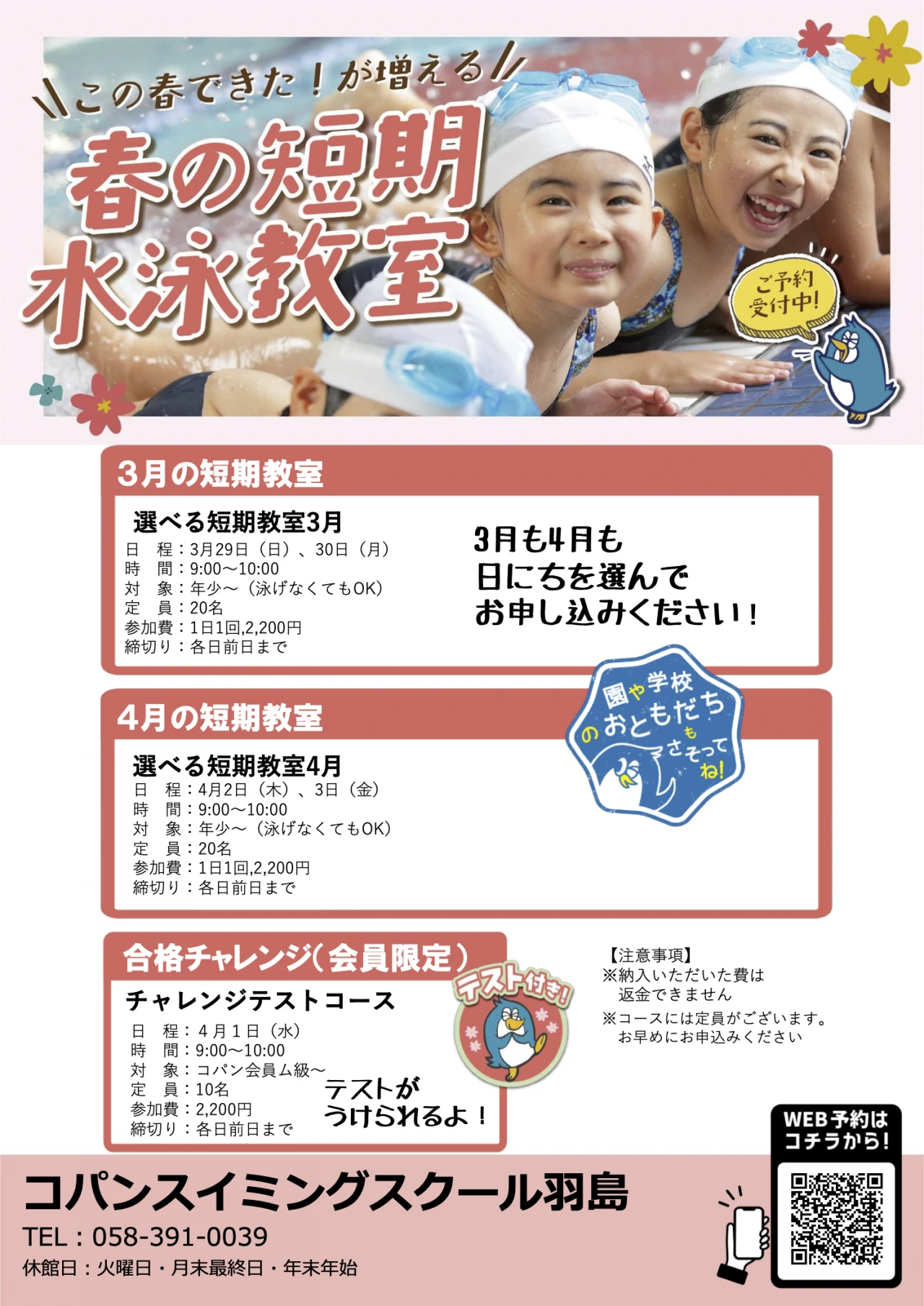 2026年春休み 短期教室開催! 2026.2.13 イベント・短期教室 春休みはコパンで楽しみましょう! 春休みコパンでプールデビュー! テストを受けて合格しよう! 春休みはプールで楽しみましょう!申し込みは↓↓↓ WEBでお申込み お申込みフォーム 電話で申し込み 058-391-0039