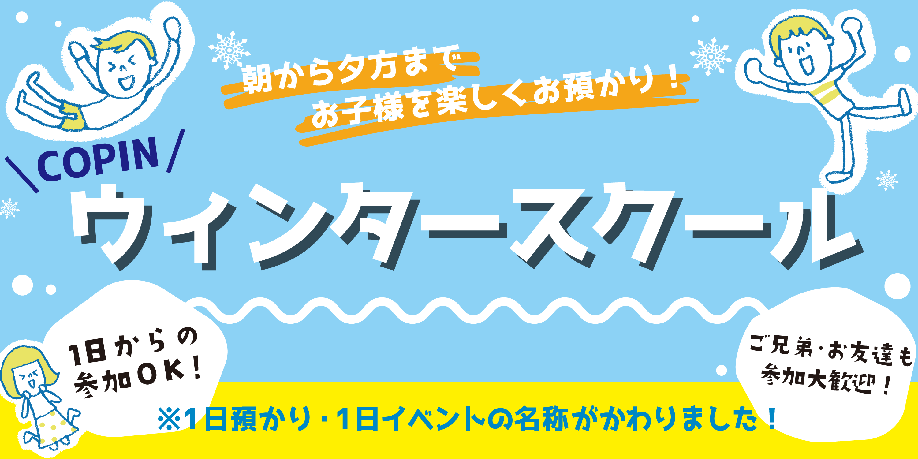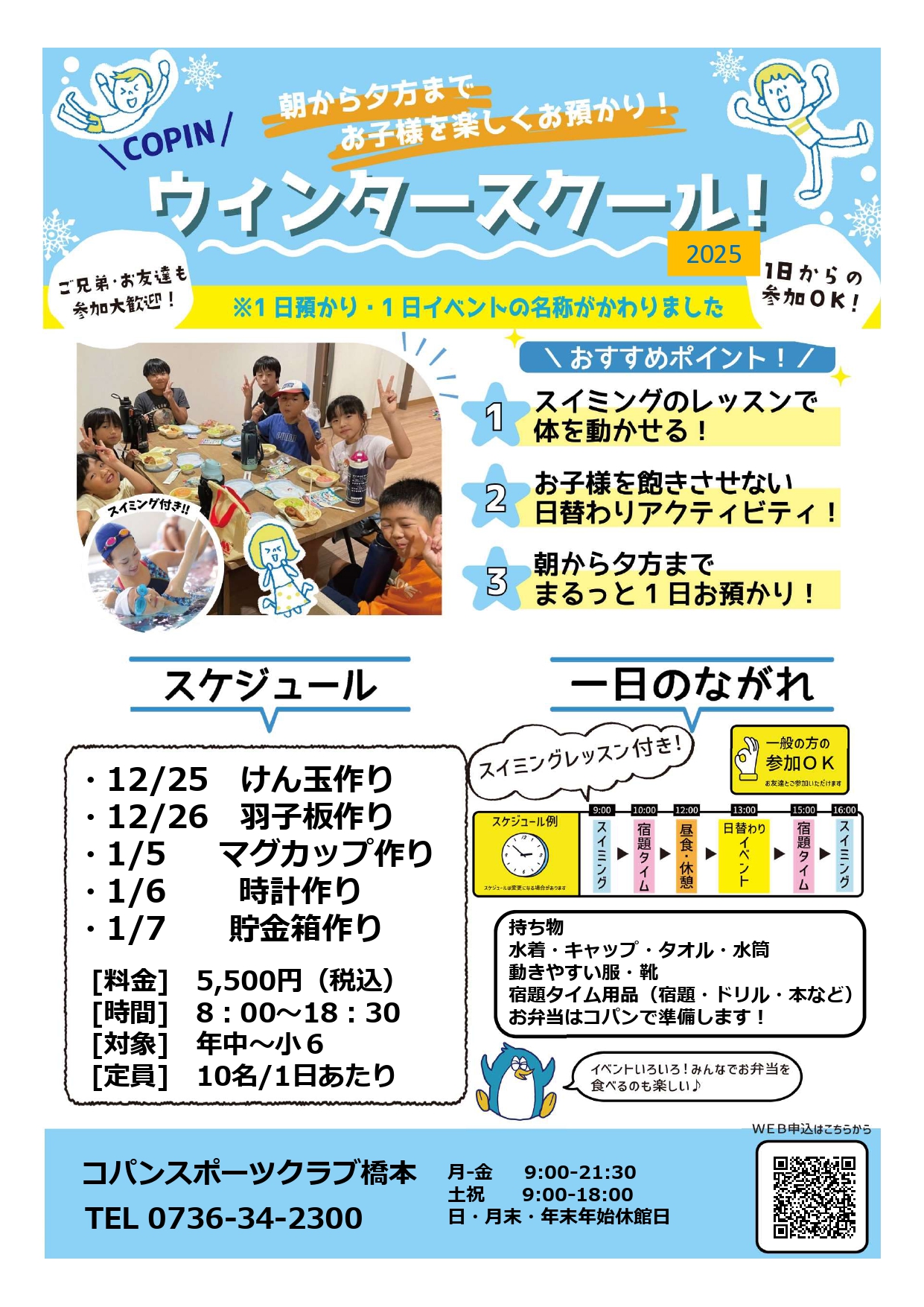 冬休み満喫ウィンタースクール(スイミングレッスン付き!) 2025.11.25 イベント・短期教室 日替わりイベントとスイミングレッスンが楽しめる冬休みウィンタースクール!宿題タイム・お弁当タイムもあり! 朝から夕方まで冬休みを満喫できます!会員以外の方も参加OK! お友達を誘って遊びに来てね! ウィンタースクール 12月25日・26日 1月5日~7日 8:00~18:30(時間内は、来館・帰宅時間は保護者の方に合わせて決めていただけます) 1日 5,500円(税込) 毎日、日替わりで外遊びか工作の時間もあります。オリジナル商品を作って、お家に持って帰ろう! WEBでお申込み お申込みフォーム 電話で申し込み 0736-34-2300 WEBでお申込み お申込みフォーム 電話で申し込み 0736-34-2300 ウィンタースクール詳細はこちら!(SIZE:1.14MB)