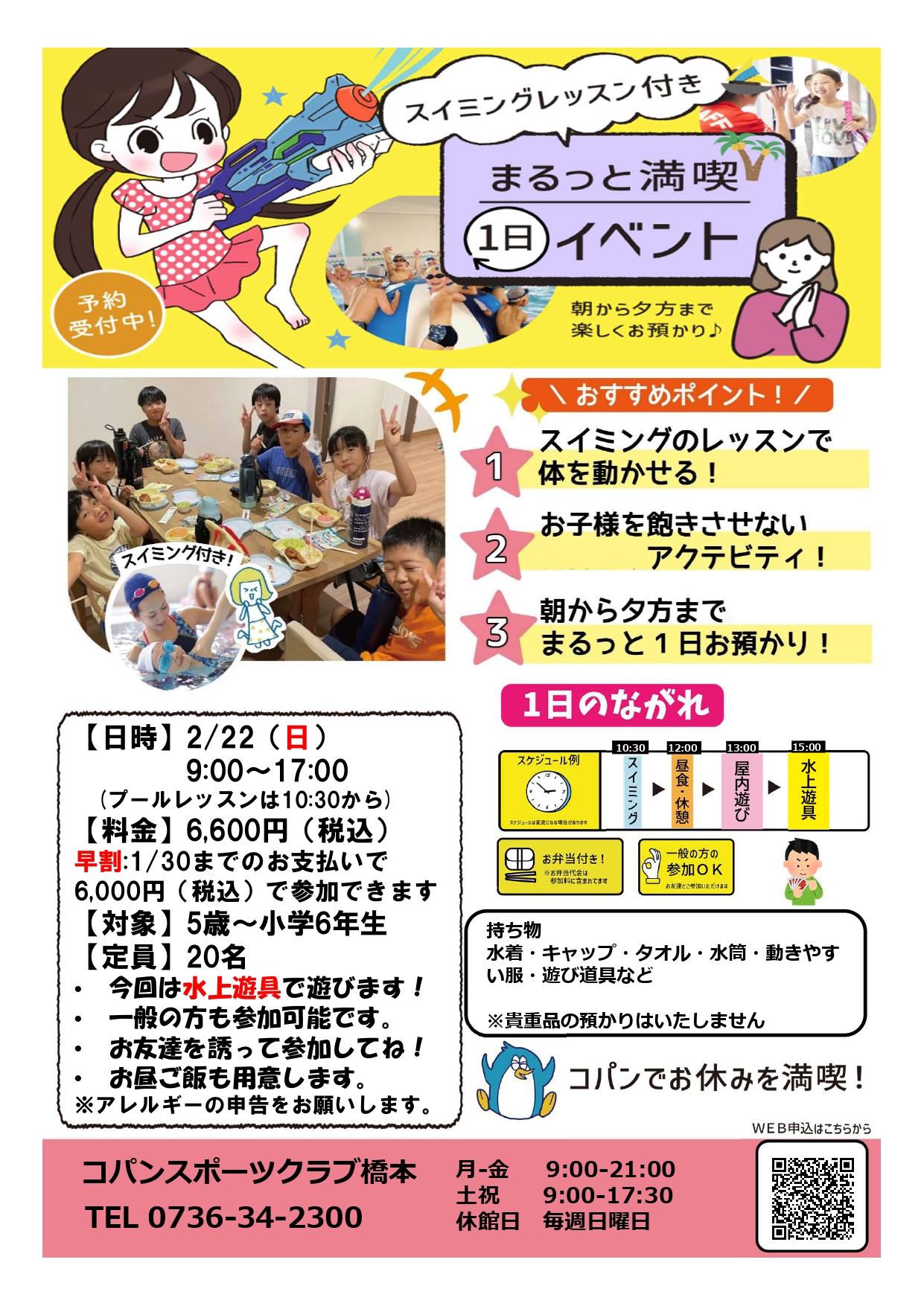 まるっと1日コパンを楽しみつくそう!(水上遊具) 2026.1.16 イベント・短期教室 プールだけじゃない!コパンは1日中遊べる楽しいイベントを実施しています。 2/22(日)9:00~17:00 プールレッスン付きで1日中遊べるコパン満喫プランです。 今回はお昼から水上遊具で遊びます。 日時 2026/2/22(日) 9:00~17:00 (プールレッスンは10:30からです。それまでにお越しください。) 料金 6,600円(税込) 早割価格:1/30までのお支払いで6,000円(税込)で参加していただけます 対象 5歳~小学6年生までのお子様 (スクール外の子も参加できます) 持ち物 水着・キャップ(必要であればゴーグル)・タオル・水筒・動きやすい服・屋内用遊び道具(こちらでもご用意します) ※貴重品のお預かりはいたしません。あまり持ってこないようにお願いします。 定員 先着順20名(支払いをもってご予約が完了します。) ネット・お電話は「仮予約」といたします。 2/22(日)9:00~17:00プールレッスン付きで1日中遊べるコパン満喫プランです。今回はお昼から水上遊具で遊びます。お昼ご飯もご用意いたします。お友達を誘って参加してね♪ WEBでお申込み お申込みフォーム 電話で申し込み 0736-34-2300 ファイル1(SIZE:1.22MB)