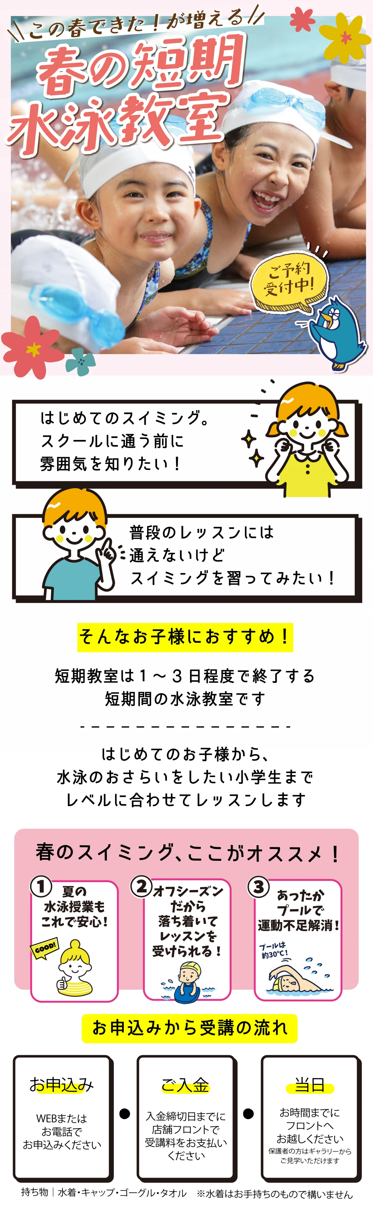 - 水着・キャップ・タオルをご持参ください。