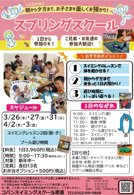 スプリングスクール…スイミングレッスン2回付き!朝から夕方まで1日預かります!