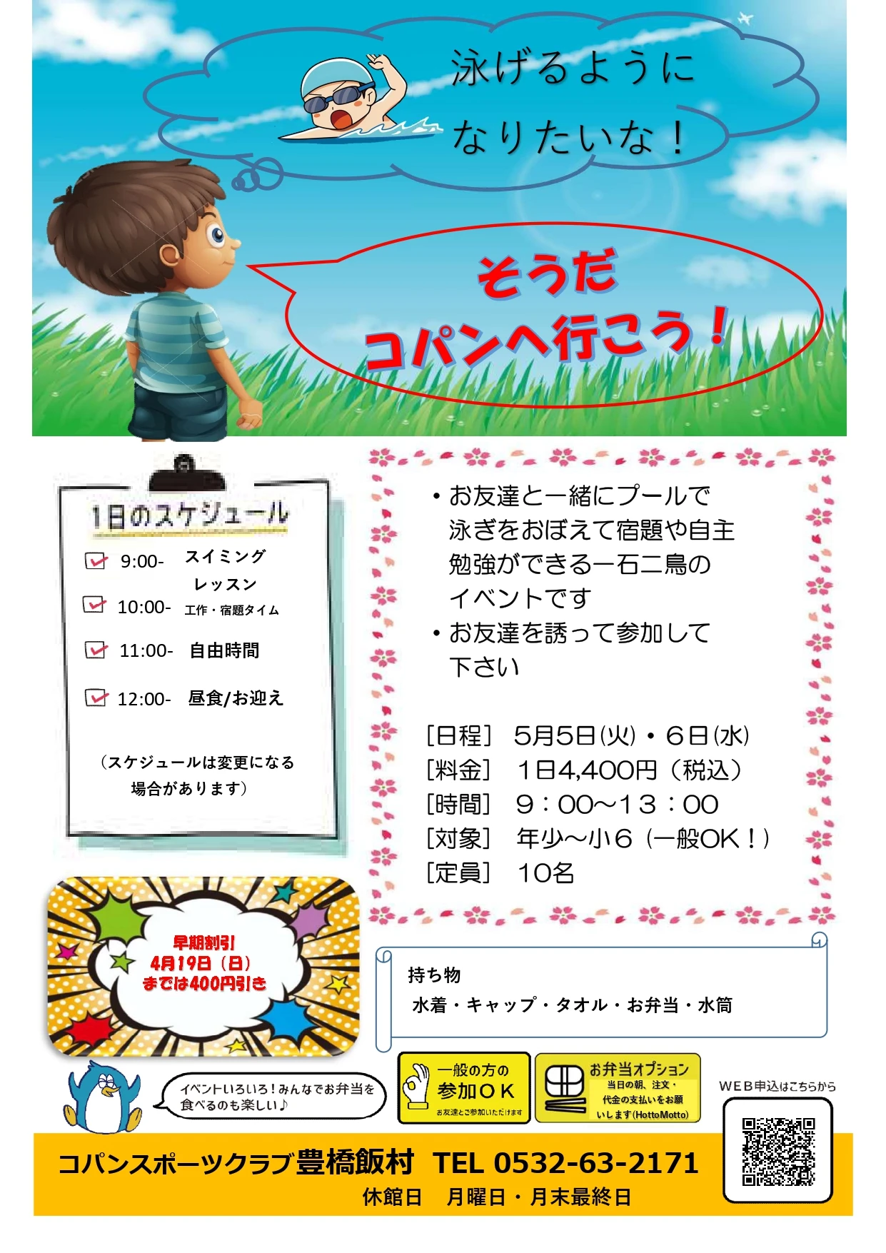 GWのお預かり短期 2026.4.10 イベント・短期教室 学童保育の代わりにお預かり型スイミング 学童保育の代わりにお預かり型スイミング スイミングレッスン・工作・宿題をやります。 WEBでお申込み お申込みフォーム 電話で申し込み 0532-63-2171 学童保育の代わりにお預かり型短期教室 WEBでお申込み お申込みフォーム 電話で申し込み 0532-63-2171