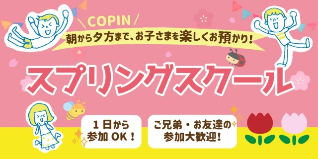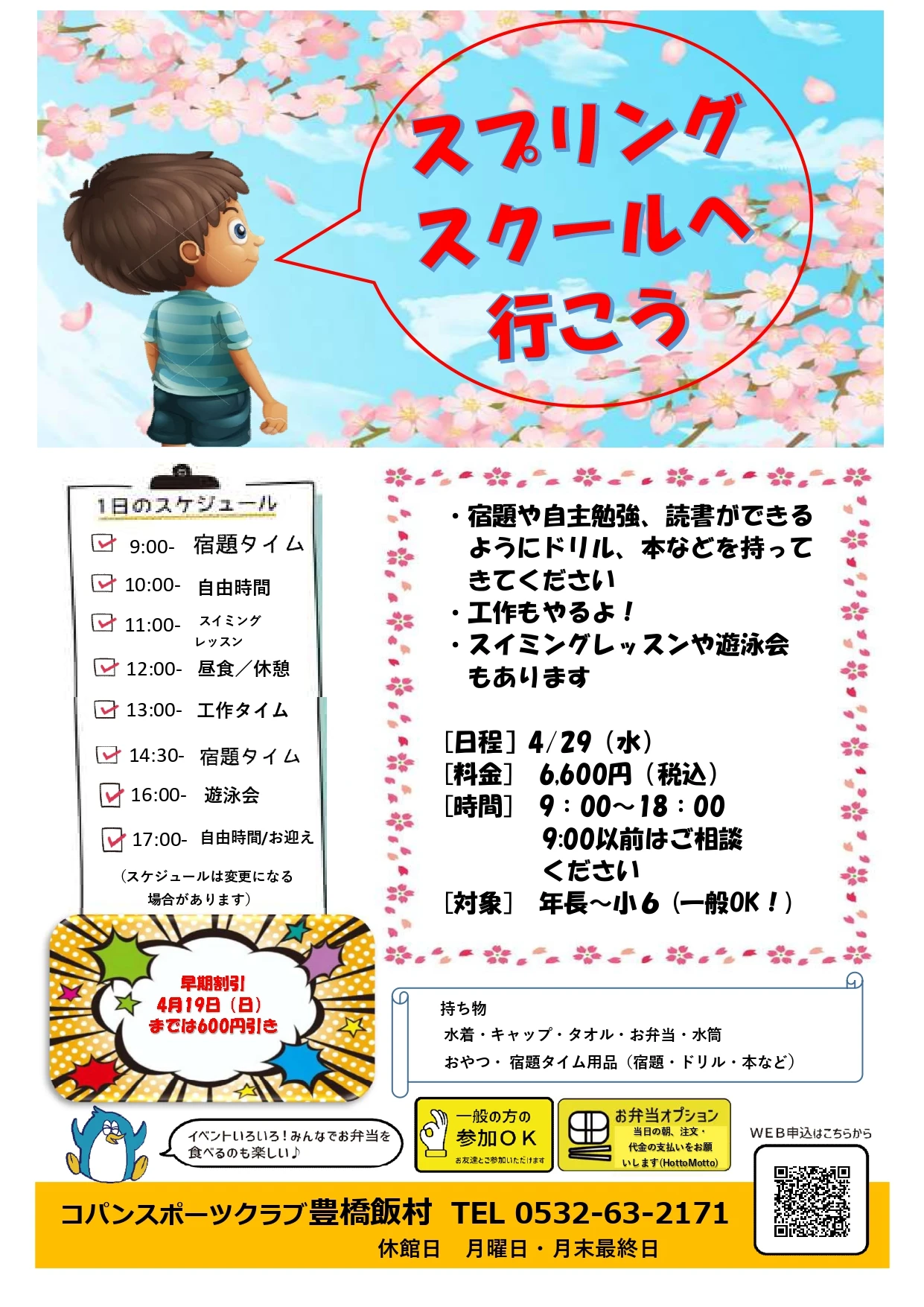 スプリングスクール(スイミングレッスン付き) 2026.4.10 イベント・短期教室 スイミングレッスンが楽しめるスプリングスクール! 宿題タイム・お弁当タイム・工作もあり! 朝から夕方まで春休みを満喫できます!会員以外の方も参加OK! お友達を誘って遊びに来てね! WEBでお申込み お申込みフォーム 電話で申し込み 0532-63-2171 WEBでお申込み お申込みフォーム 電話で申し込み 0532-63-2171
