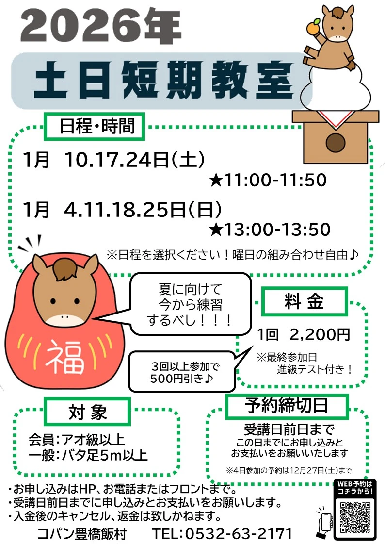 土日スイミング短期教室 2025.12.12 イベント・短期教室 土曜日に短期教室開催決定! ●テストがもうちょっとだった子 ●テストが受けれなかった子 ●上手く泳げるようになりたい子 ぜひご参加ください! WEBでお申込み お申込みフォーム 電話で申し込み 0532-63-2171 WEBでお申込み お申込みフォーム 電話で申し込み 0532-63-2171