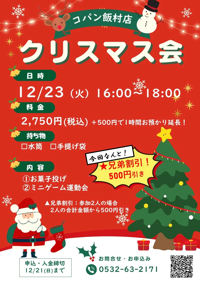 クリスマス会★2025 2025.11.26 イベント・短期教室 お友達とコパンのクリスマス会で遊ぼう! コパンのクリスマス会開催♪ コパンのお友達はもちろん!学校のお友達や兄弟と一緒に参加しよう! 大量のお菓子ゲットのチャンスやミニゲームで盛り上がろう♪ WEBでお申込み お申込みフォーム 電話で申し込み 0532-63-2171