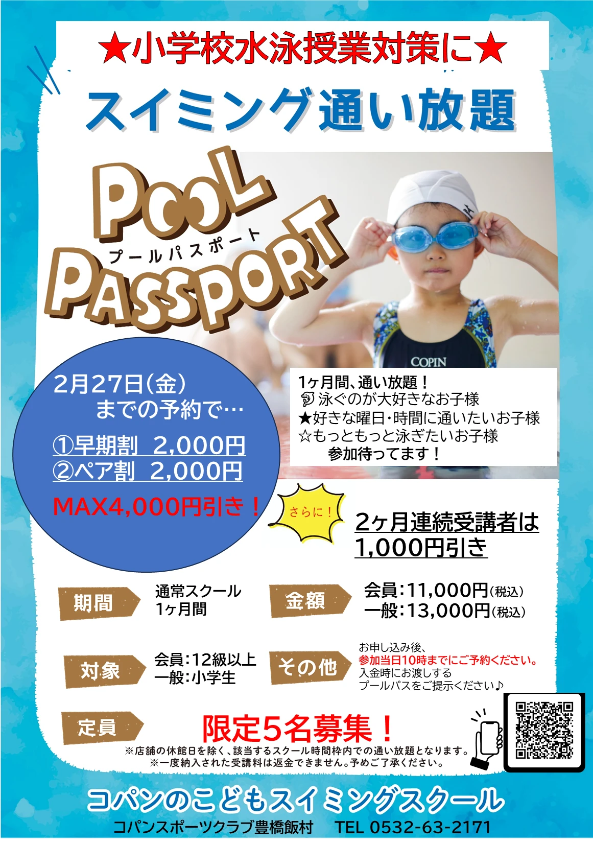 3月期・4月期スイミング通い放題 2026.2.8 イベント・短期教室 泳ぐのが大好きなお子様 好きな曜日・時間に通いたいお子様 もっともっと泳ぎたいお子様 参加待ってます! ※ご予約は2月15日(日)からお願いします 満員御礼 別日程につきましては、店舗までお問い合わせください