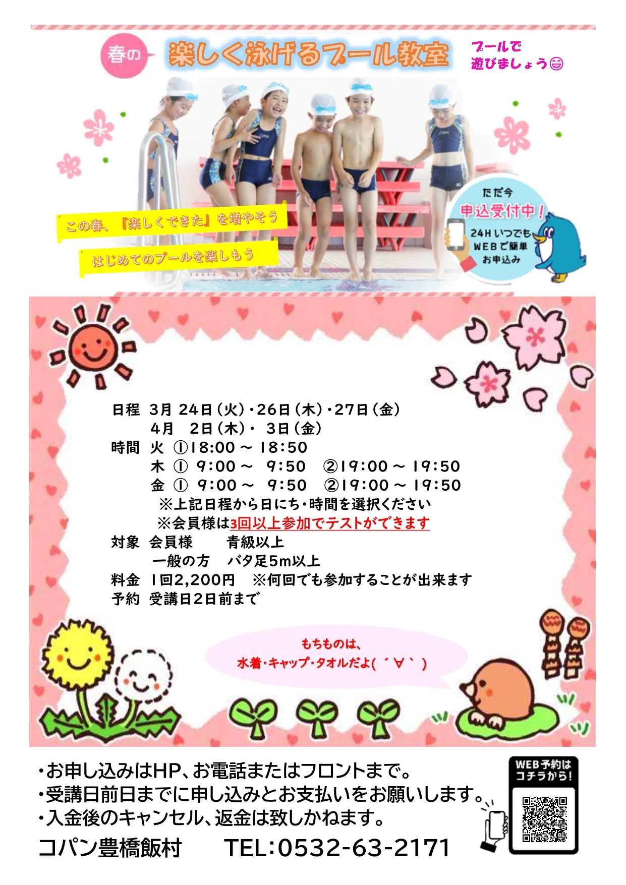 楽しく泳げるプール教室 2026.2.13 イベント 開催 : 2026年3月24日(火) ~ 2026年4月3日(金) WEBでお申込み お申込みフォーム 電話で申し込み 0532-63-2171 WEBでお申込み お申込みフォーム 電話で申し込み 0532-63-2171