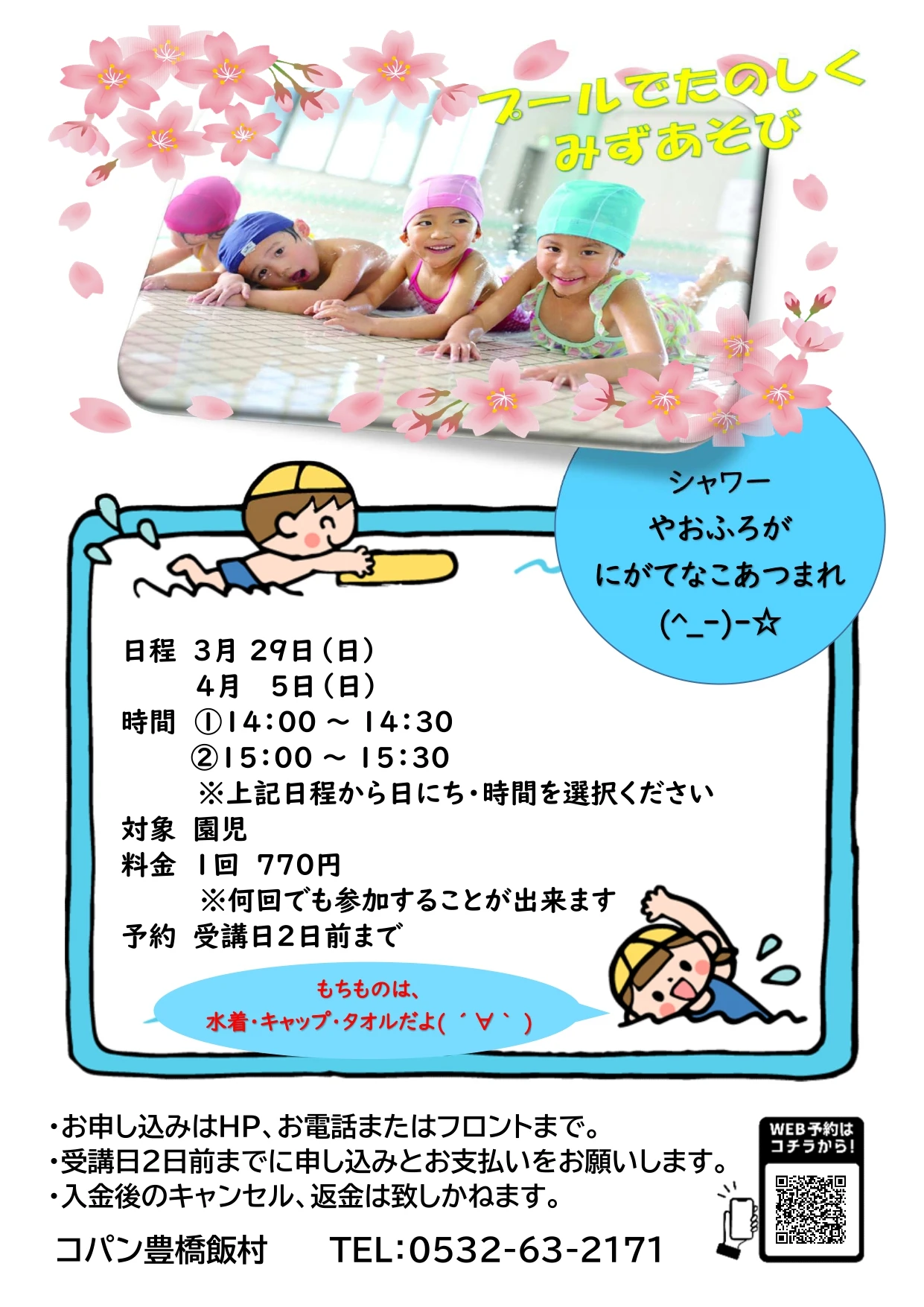 最近の記事 【子供スイミング】3月はじめてのお子様のための定期スクール無料体験会実施中 2026.3.5 イベント more とにかく可愛い!キッズチア 3月4月無料体験 2026.3.5 イベント more 【子供スイミング】はじめてのお子様のための土・日無料体験会開催中♬ 2026.3.5 イベント more 学校水泳の先取り教室 2026.2.15 イベント・短期教室 more