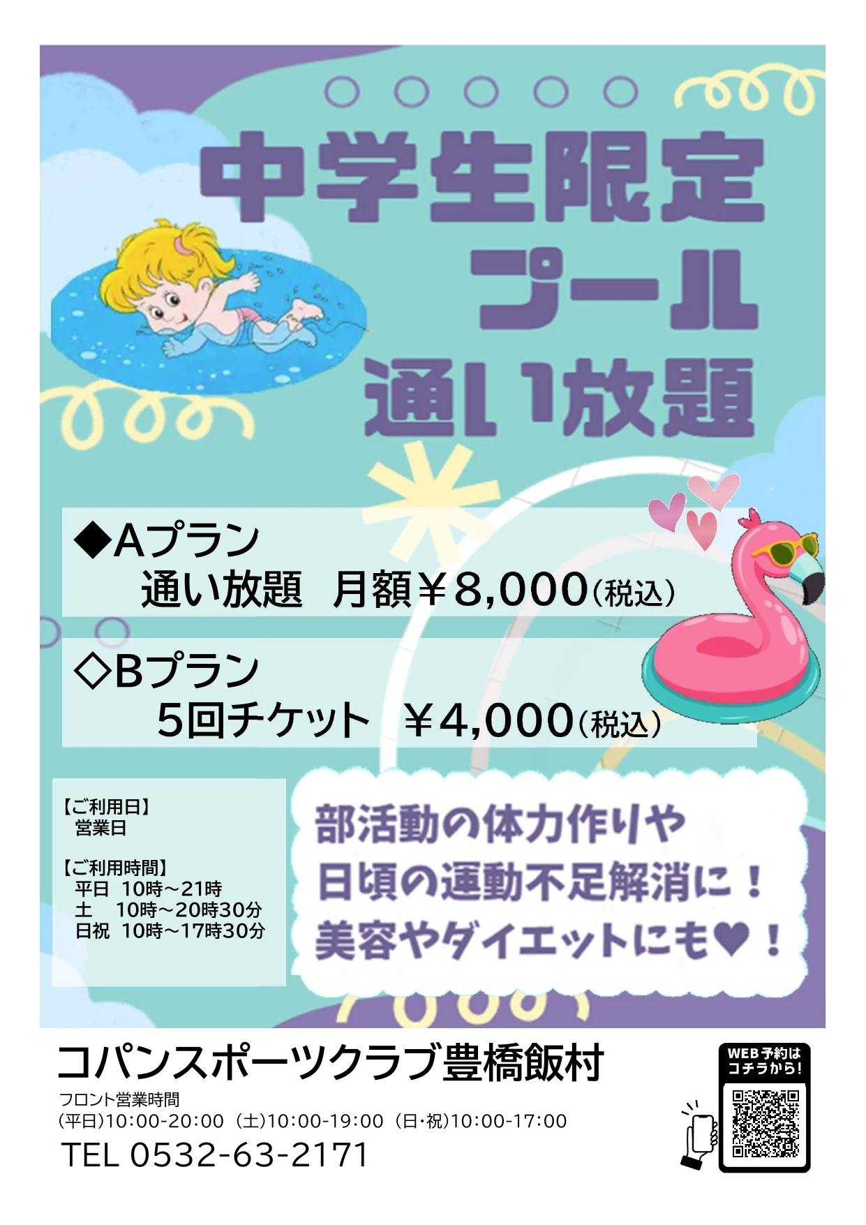 【中学生限定】☆☆☆プール 使い放題☆☆☆ 2026.4.10 イベント・短期教室 体力作り! 運動不足解消! ダイエット! 運動をして肌も綺麗に! WEBでお申込み お申込みフォーム 電話で申し込み 0532-63-2171 WEBでお申込み お申込みフォーム 電話で申し込み 0532-63-2171