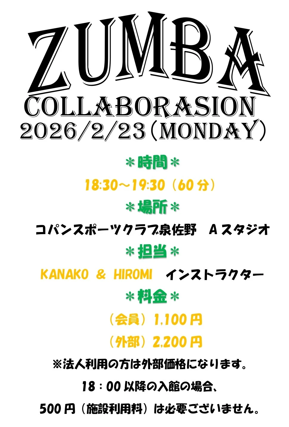 コパン de ZUMBAパーティ! 2026.1.28 イベント 開催 : 2026年2月23日(月) ~ 2026年2月23日(月) 2025年最後にしたスタジオイベントを新年にも!! KANAKOインストラクターとHIROMIインストラクターと一緒にコパンを満喫しましょう! Let’s Party Let’s ZUMBA♪ WEBでお申込み お申込みフォーム 電話で申し込み 072-463-3305 WEBでお申込み お申込みフォーム 電話で申し込み 072-463-3305 カレンダーを見る イベント一覧を見る