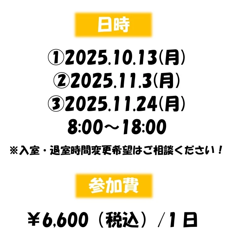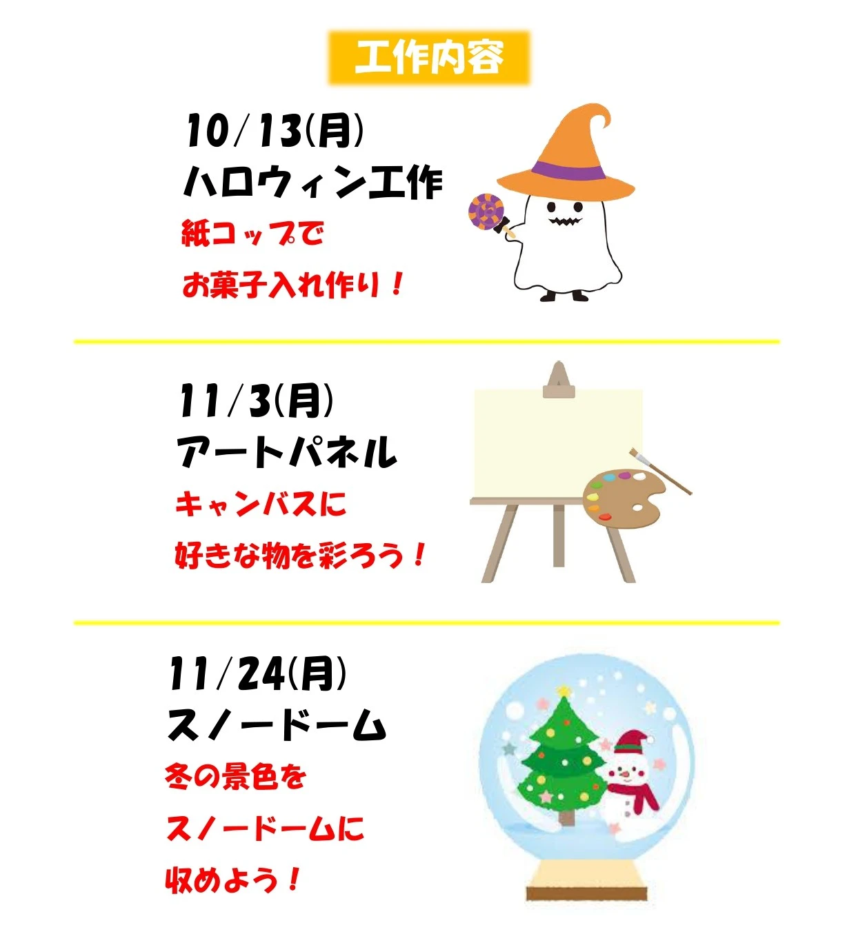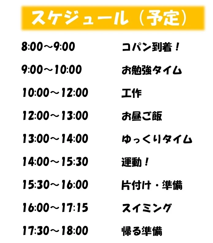 1日お預かりイベント!(選べる本科スクール体験付き!) 2025.10.1 イベント・短期教室 祝日に1日イベントを開催します! 体育やスイミング、レクリエーションなど様々な楽しいことがたくさん!! 朝から夕方まで休みを満喫できます!会員以外の方も参加OK! お友達を誘って遊びに来てね! 日程 ①2025年10月13日(月) ②2025年11月3日(月) ③2025年11月24日(月) 定員 10名 料金 6,600円(税込) 開催日の3日前までにご入金お願い致します。 ご入金後のご返金は不可能となります。 持ち物 水着、スイミングキャップ、水筒、宿題、上履き WEBでお申込み お申込みフォーム 電話で申し込み 072-463-3305 WEBでお申込み お申込みフォーム 電話で申し込み 072-463-3305