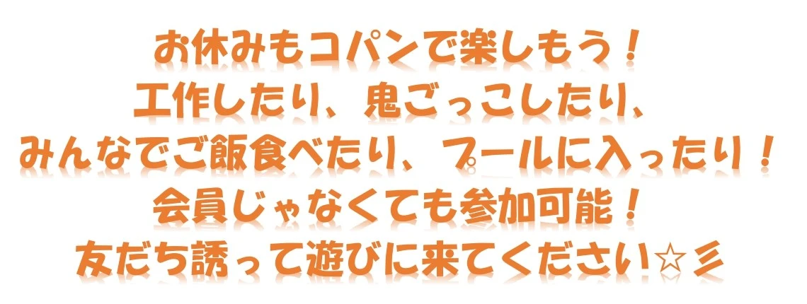 最近の記事 おかわり朝練!泳ぎ込み短期教室 2025.10.1 イベント・短期教室 more コパンハロウィンパーティー! 2025.10.1 イベント・短期教室 more 10月スイミング無料体験会を開催します♬ 2025.9.12 イベント more 秋のスイミング♪わくわく入会キャンペーン! 2025.9.8 キャンペーン more