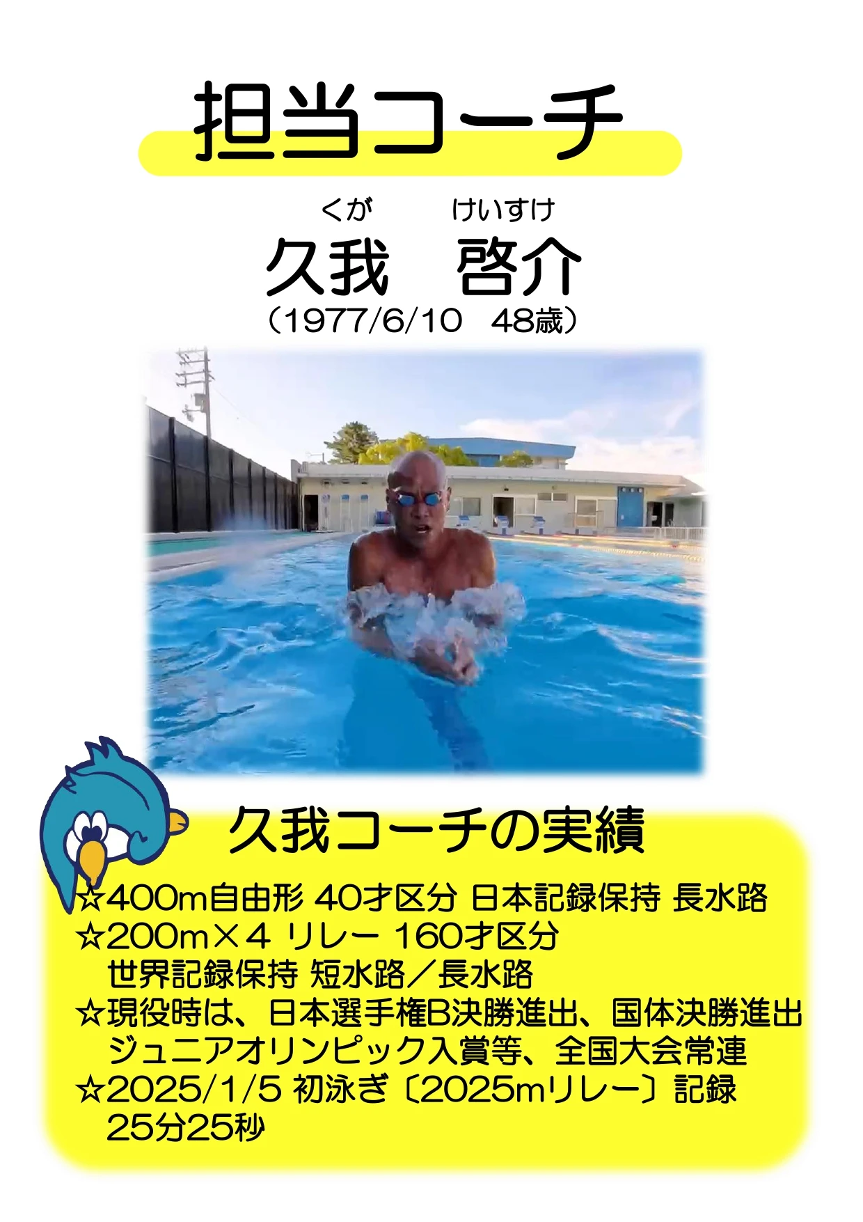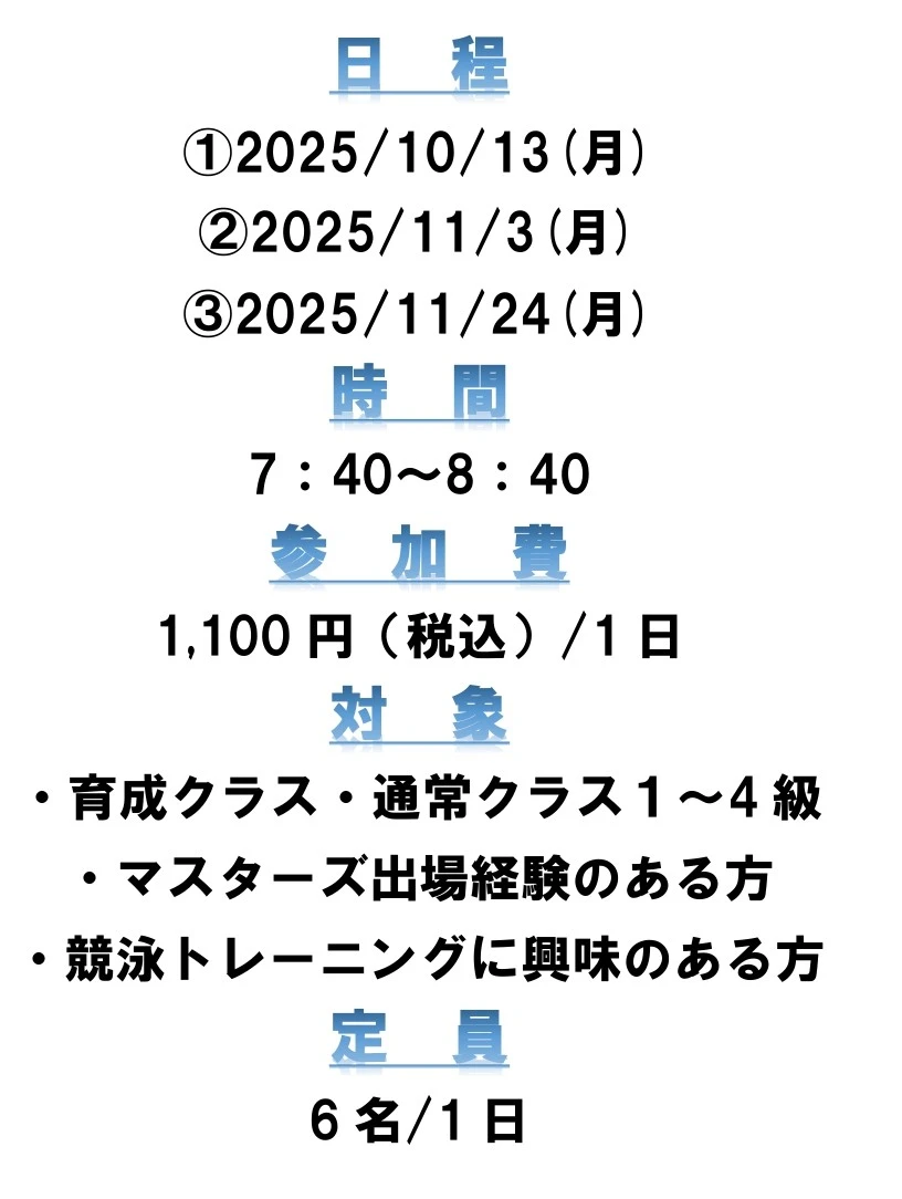 おかわり朝練!泳ぎ込み短期教室 2025.10.1 イベント・短期教室 おかわり朝練!泳ぎ込み1日短期を開催! 基礎体力の向上やターン練習・タイムアップなどをメインとした短期教室です。 育成クラス・通常クラス1~4級に加え、競泳トレーニングにご興味のある大人の方も参加可能! どしどしご参加ください! 日程 ①2025年10月13日(月) ②2025年11月3日(月) ③2025年11月24日(月) 対象 〔子ども〕育成クラス・通常クラス1~4級 〔大人〕マスターズ出場経験のある方・競泳トレーニングに興味のある方 定員 各6名 料金 ¥1,100円(税込)/1日 開催日の3日前までにご入金お願い致します。 ご入金後のご返金は不可能となります。 持ち物 水着・キャップ・タオル・ゴーグル(無しでもOK) WEBでお申込み お申込みフォーム 電話で申し込み 072-463-3305 WEBでお申込み お申込みフォーム 電話で申し込み 072-463-3305