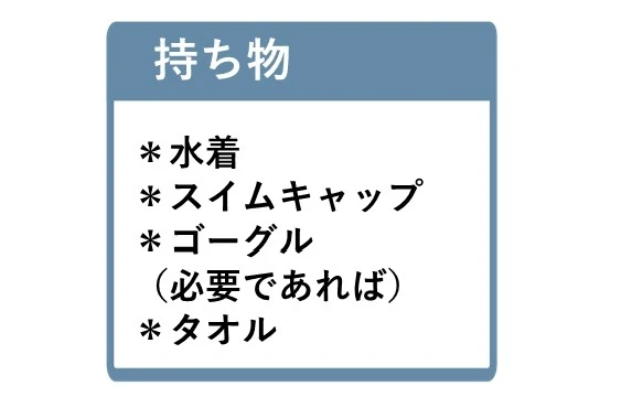 - 水着・キャップ・タオル・ゴーグル(無しでもOK)
