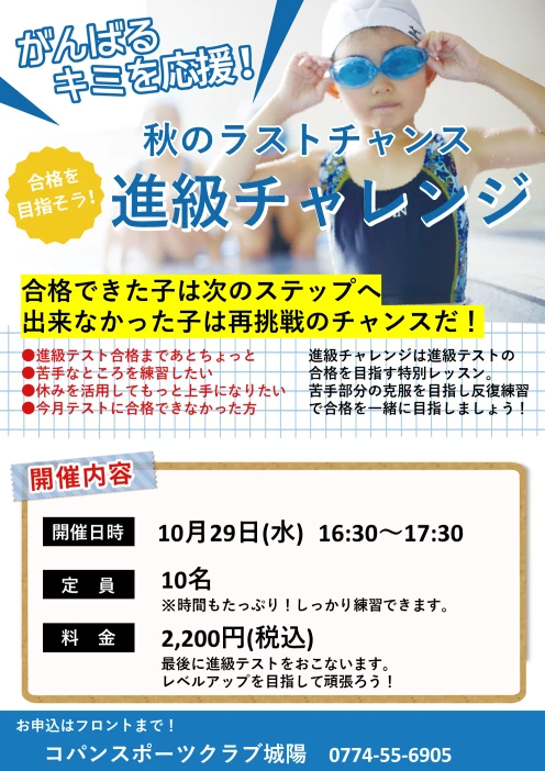 25年10月進級チャレンジ 2025.10.17 イベント・短期教室 がんばるキミを応援! この秋、ラストチャンス 合格を目指そう! 日時 10/29(水)16:30~17:30 定員 10名 料金 2200円(税込) ※最後に進級テストを行います。 WEBでお申込み お申込みフォーム 電話で申し込み 0774-55-6905