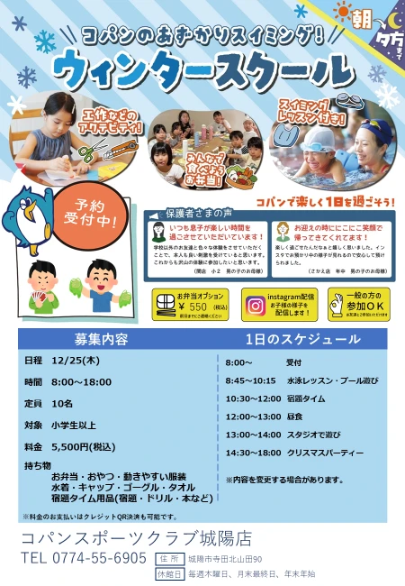 ウィンタースクール2025 2025.11.17 イベント・短期教室 冬休みだ!【1日預かりイベント】 朝から夕方までお子様をお預かりします! 会員以外の方も参加OK! お友達を誘って遊びに来てね! 日程 12/25(木) 時間 8:00~18:00 対象 小学生以上 定員 10名 料金 5,500円(税込) ※お弁当を注文する場合は別途550円(税込)必要です。 持ち物 水筒・お弁当・ハンカチ・タオル類 水着・キャップ・ゴーグル 宿題・筆記用具・ ワークブックや読書用の本などございましたらご自由にお持ちください。 WEBでお申込み お申込みフォーム 電話で申し込み 0774-55-6905