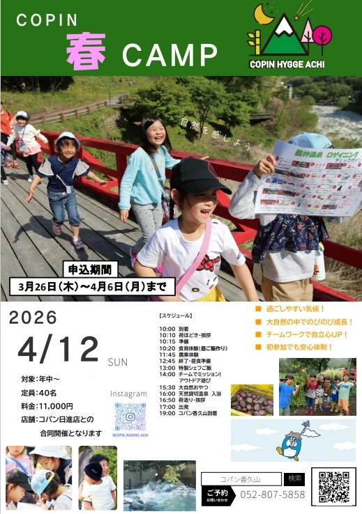【コパン生限定】4月12日(日)日帰りキャンプ 3/26(木)WEBのみで予約受付開始!