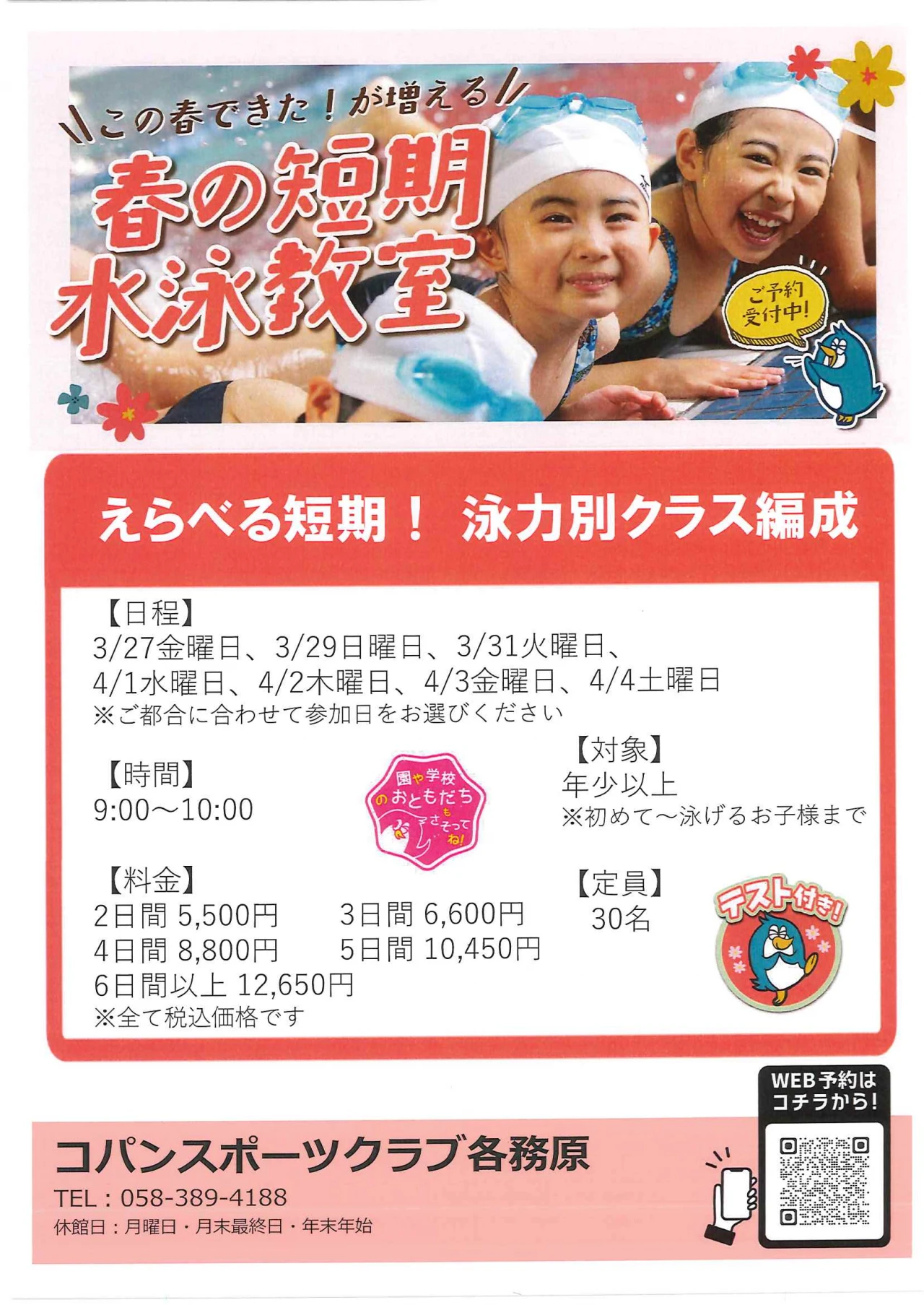 ★春短期教室★ 2026.2.10 イベント・短期教室 【春休み短期教室】開催♪ いつもはスイミングに通えないお子様も短い期間で気軽にコパンのレッスンを体験できます! プールが初めてのお子様、お友だちやご兄弟と一緒に参加も大歓迎! お気軽にご参加ください♪ 詳細 詳しくは下記申込フォームをご確認下さい。 WEBでお申込み お申込みフォーム 電話で申し込み 058-389-4188 WEBでお申込み お申込みフォーム 電話で申し込み 058-389-4188