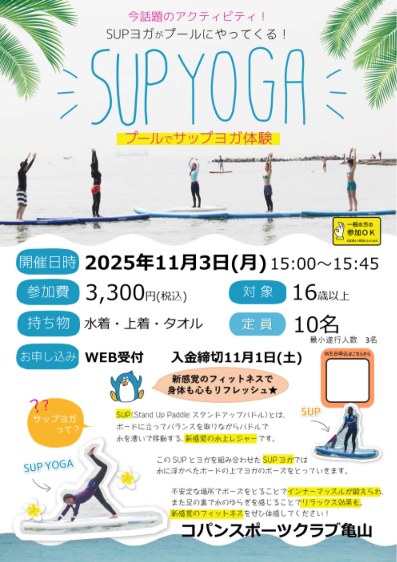 SUPヨガイベント 2025.10.7 イベント SUPヨガがコパン亀山店のプールにやってくる! 開催 : 2025年11月3日(月) ~ 2025年11月3日(月) SUPヨガは水に浮かべたボードの上でヨガのポーズをとっていきます! 不安定な場所でポーズをとることでインナーマッスルが 鍛えられ、また足の裏で水のゆらぎを感じることでリラックス効果も期待できます。 新感覚のフィットネスをぜひ体感してください! WEBでお申込み お申込みフォーム 電話で申し込み 0595-82-6760 一般の方や親子でも参加OK!申込・入金締切は11/1(土)まで!下記お申込フォームよりご予約を承りしております。 WEBでお申込み お申込みフォーム 電話で申し込み 0595-82-6760 カレンダーを見る イベント一覧を見る