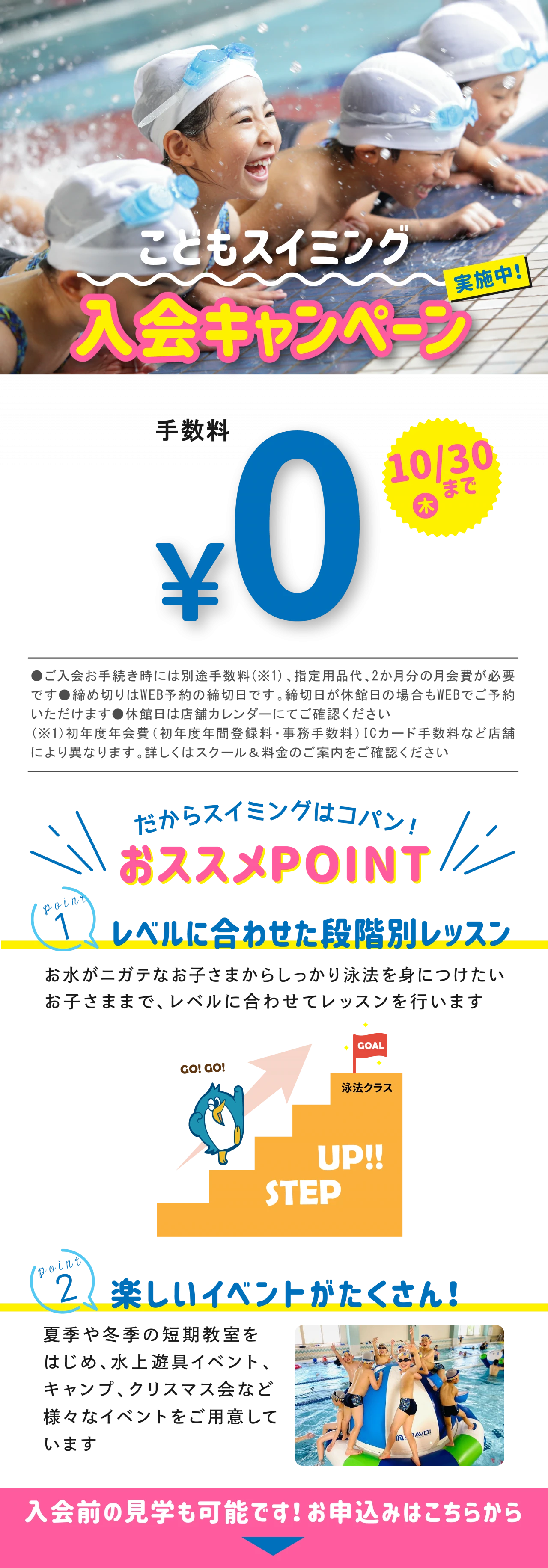 秋のスイミング♪わくわく入会キャンペーン! 2025.9.8 キャンペーン お子様の成長は早いから、思い立った時が始めどき♪ 4万人のお子様が通うスイミングスクール★ はじめてのお子様もご安心ください♪ WEBでお申込み お申込みフォーム 電話で申し込み 0595-82-6760 WEBでお申込み お申込みフォーム 電話で申し込み 0595-82-6760