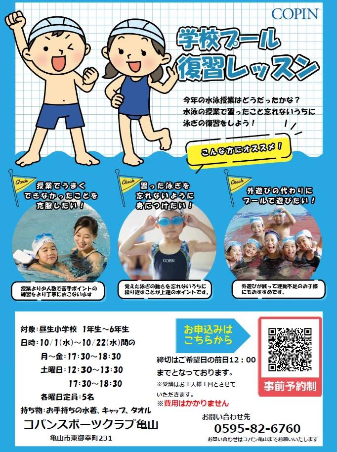 【昼生小学校の方限定】学校プール 復習レッスン! 2025.9.25 イベント 泳ぎの復習をしよう! 開催 : 2025年10月1日(水) ~ 2025年10月22日(水) 学校水泳授業はどうだったかな? 水泳の授業で習ったことを忘れないうちに 泳ぎの復習をしよう! こんな方にオススメ! ①授業でうまく出来なかったことを克服したい! ②習った泳ぎを忘れないように身につけたい! ③外遊びの代わりにプールで思い切り 体を動かしたい! 友達を誘って練習しましょう♪ WEBでお申込み お申込みフォーム 電話で申し込み 0595-82-6760 WEBでお申込み お申込みフォーム 電話で申し込み 0595-82-6760