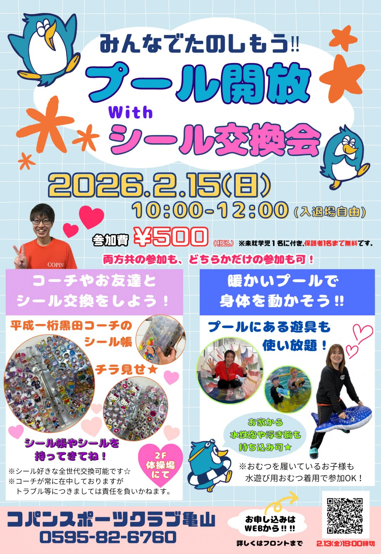 2/15㈰プール開放イベント! 2026.1.26 イベント・短期教室 家族みんなで温かいプールで遊ぼう! 楽しい遊具も使いたい放題、お家から水鉄砲など持ってきてもOK! 写真撮影も可能です。 お申し込みは、下記フォームまたはフロントにて承ります。 WEBでお申込み お申込みフォーム 電話で申し込み 0595-82-6760 WEBでお申込み お申込みフォーム 電話で申し込み 0595-82-6760