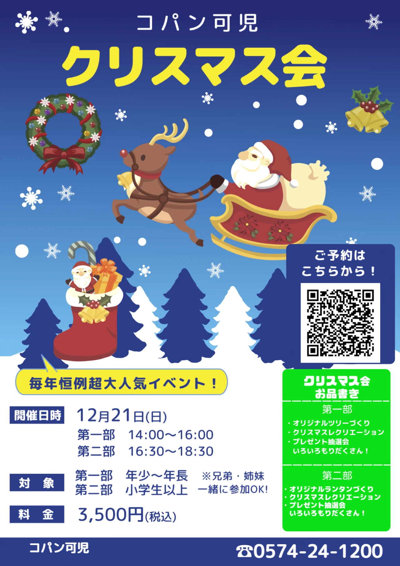 2025年コパンのクリスマス会! 2025.11.8 イベント・短期教室 去年も大好評だったクリスマス会を 今年もやります! コパンのクリスマス会を今年もやります! いろんな催し物を準備しているので みんなで参加してね♪ WEBでお申込み お申込みフォーム 電話で申し込み 0574-24-1200