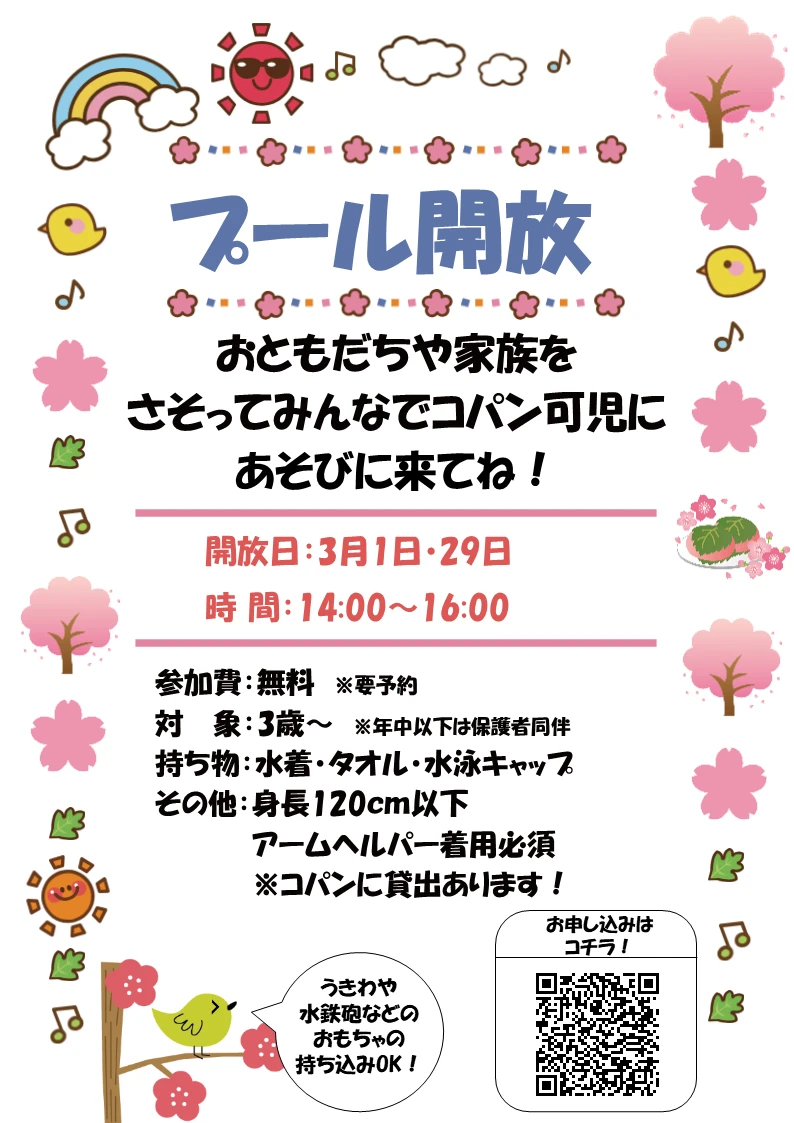 指定園向けプール開放! 2026.1.23 イベント・短期教室 可児市近郊の幼稚園・保育園向け! コパンのプール開放! 可児市近郊の幼稚園・保育園向け! コパンのプール開放! コパンのプールで自由に遊んじゃおう! WEBでお申込み お申込みフォーム 電話で申し込み 0574-24-1200