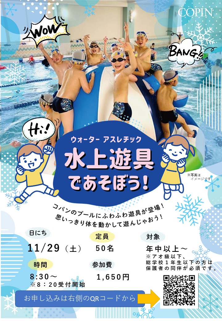 大人気イベント ■水上遊具で遊ぼう!■ 2025.11.2 イベント・短期教室 大人気イベント再び!■水上遊具で遊ぼう!■大人気の水上遊具がやってくる!みんなで思いっきり遊んじゃおう♪日時11月29日(土) 8:30~10:00(受付 8:20~)対象コパン会員、一般※小学1年生以下・アオ級以下は保護者同伴が必要です。料金:1,650円(税込)11/9(日)13:00~お申し込み開始! WEBでお申込み お申込みフォーム 電話で申し込み 0586-52-3251