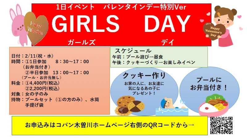 1日イベント特別Ver ガールズデイ♪ 2026.1.18 イベント・短期教室 1日イベント特別Verガールズデイ♪今回の1日イベントは女の子限定!もうすぐドキドキバレンタインデイバレンタインデイに向けてみんなで一緒の準備をしよう!気になるあの子にチョコをプレゼントだ!日付:2/11(祝・水) 時間:①8:30~17:00 (プール有、お弁当付き) ②13:00~17:00 (プール、お弁当無)料金:①4,400円(税込) ②2,200円(税込) WEBでお申込み お申込みフォーム 電話で申し込み 0586-52-3251