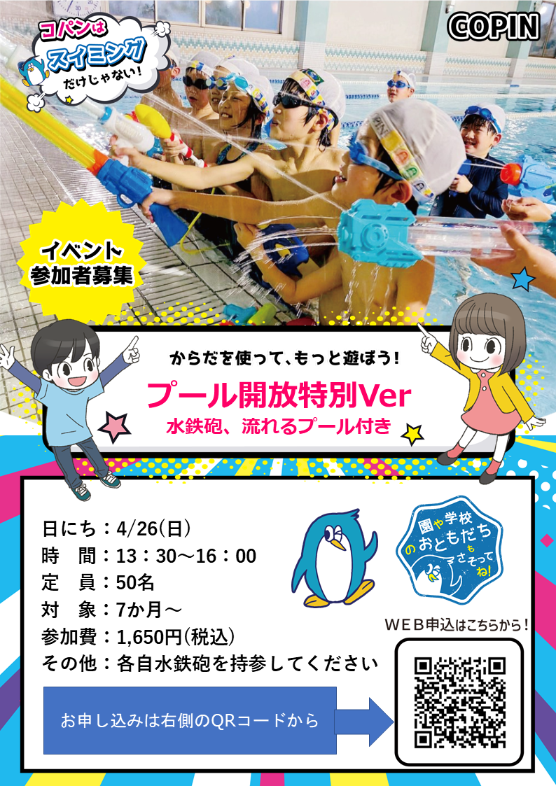 プール開放特別Ver ★水鉄砲&流れるプール★ 2026.4.12 イベント・短期教室 プール開放■特別Ver■コパンのプールで思いっきり遊びつくそう!さらに今回は・・・水鉄砲、流れるプールも!コパンのプールで思いっきり遊びつくそう!日時4月26日(日) 13:30~16:00(受付 13:20~)対象コパン会員、一般 料金:1,650円(税込)※各自水鉄砲をお持ちください WEBでお申込み お申込みフォーム 電話で申し込み 0586-52-3251