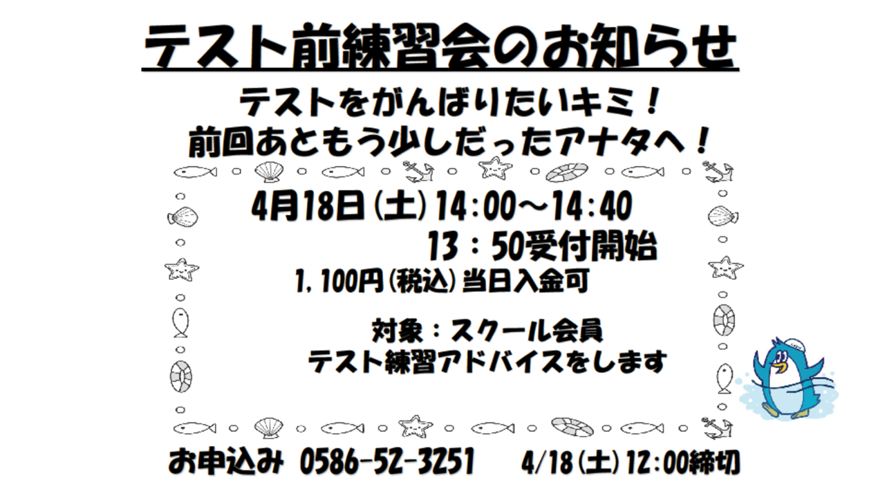 テスト前練習会! 2026.4.12 イベント・短期教室 テスト前練習会のご案内次のテストは絶対合格したい前回のテストもう少しだったテストがあるけど不安なところがあるこの練習会でさらに上達しよう!日時4/18(土) 14:00~14:40※13:50 受付開始料金1,100円(税込)対象スクール会員 WEBでお申込み お申込みフォーム 電話で申し込み 0586-52-3251
