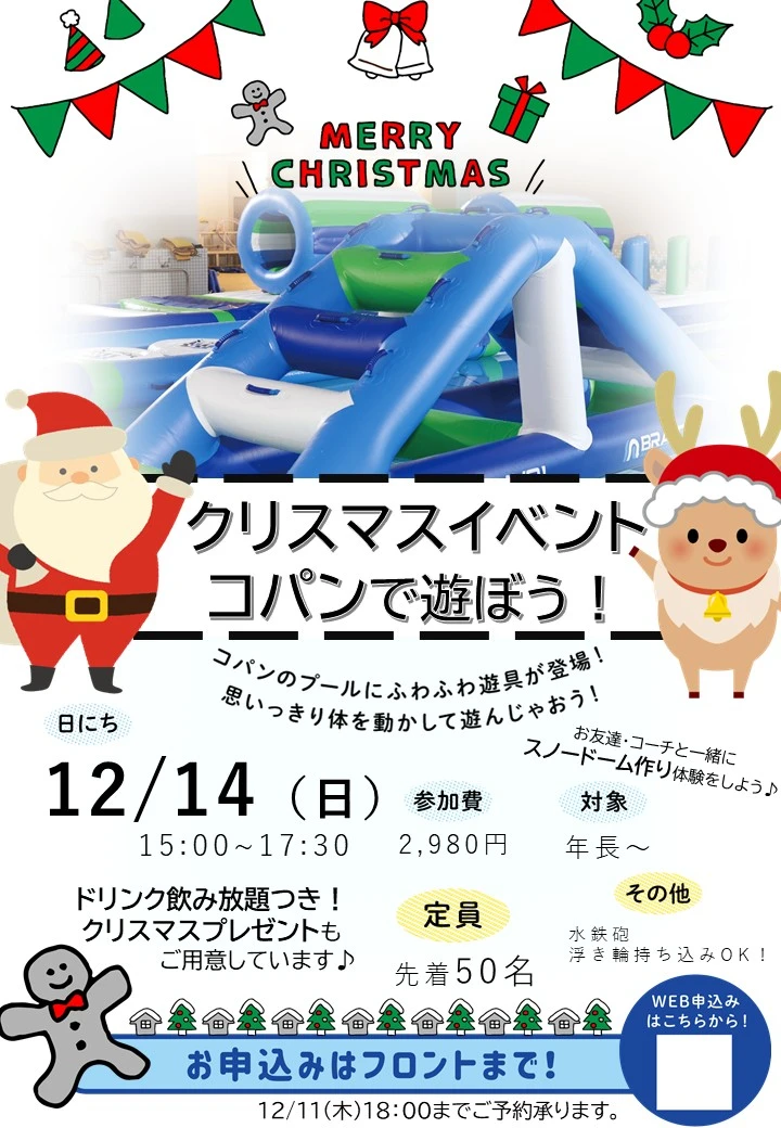 クリスマスイベント! 2025.11.17 イベント・短期教室 コーチ・お友達とクリスマス工作を体験しよう♪ 自分だけのスノードームを作り素敵な思い出を! その後は、プールの水上遊具で遊び楽しいゲーム大会も…⁉ 嬉しいクリスマスプレゼントご用意してお待ちしています!! ご予約締め切り日:12/11(木)18:00まで先着50名様!お早めにご予約下さい♪★12/13(土)20:00までにフロントで参加費をお支払いください。※キャンセルのご返金は致しかねます。予めご了承ください。 WEBでお申込み お申込みフォーム 電話で申し込み 0532-47-2121 ファイル1(SIZE:205.27KB)