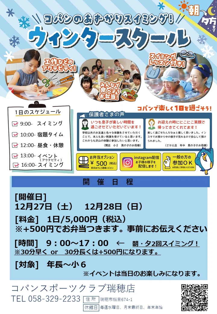 12月ウィンタースクールのご案内 2025.11.17 イベント・短期教室 コパンに通っていないお子様でもご参加いただけます!!是非、たくさんのお友達を誘ってご参加ください!! WEBでお申込み お申込みフォーム 電話で申し込み 058-329-2233