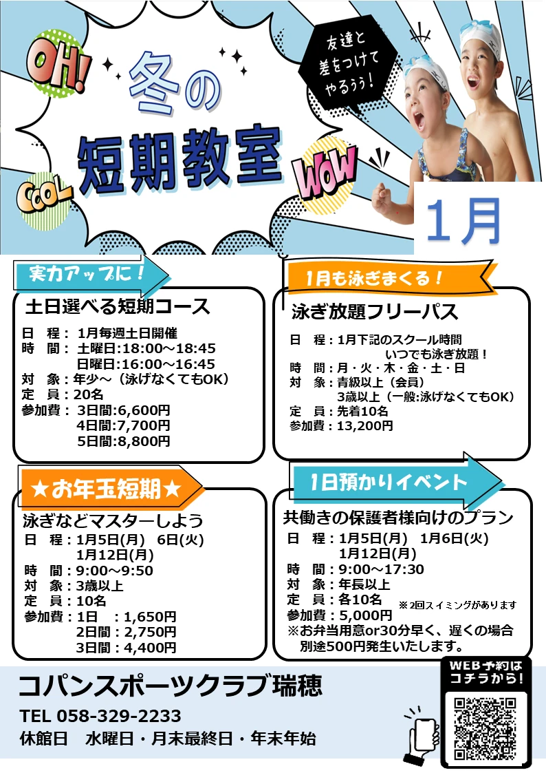 1月の短期教室ご案内 2025.12.16 イベント・短期教室 コパンのプールで泳げるようになろう♪ 短期間で泳げるようになりたいお子様も、 プールで楽しく泳ぎたいお子様も是非ご参加ください! WEBでお申込み お申込みフォーム 電話で申し込み 058-329-2233 詳細は、下記添付資料からご確認ください。またご不明点等ございましたら、ご気軽に電話やメール等からお問い合わせください。 WEBでお申込み お申込みフォーム 電話で申し込み 058-329-2233