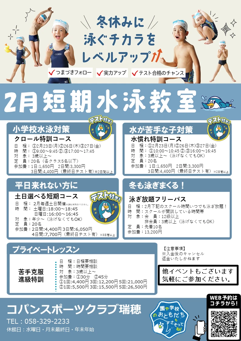 2月の短期教室ご案内 2026.1.19 イベント・短期教室 コパンのプールで泳げるようになろう♪ 短期間で泳げるようになりたいお子様も、 プールで楽しく泳ぎたいお子様も是非ご参加ください! WEBでお申込み お申込みフォーム 電話で申し込み 058-329-2233 詳細は、下記添付資料からご確認ください。またご不明点等ございましたら、ご気軽に電話やメール等からお問い合わせください。 WEBでお申込み お申込みフォーム 電話で申し込み 058-329-2233